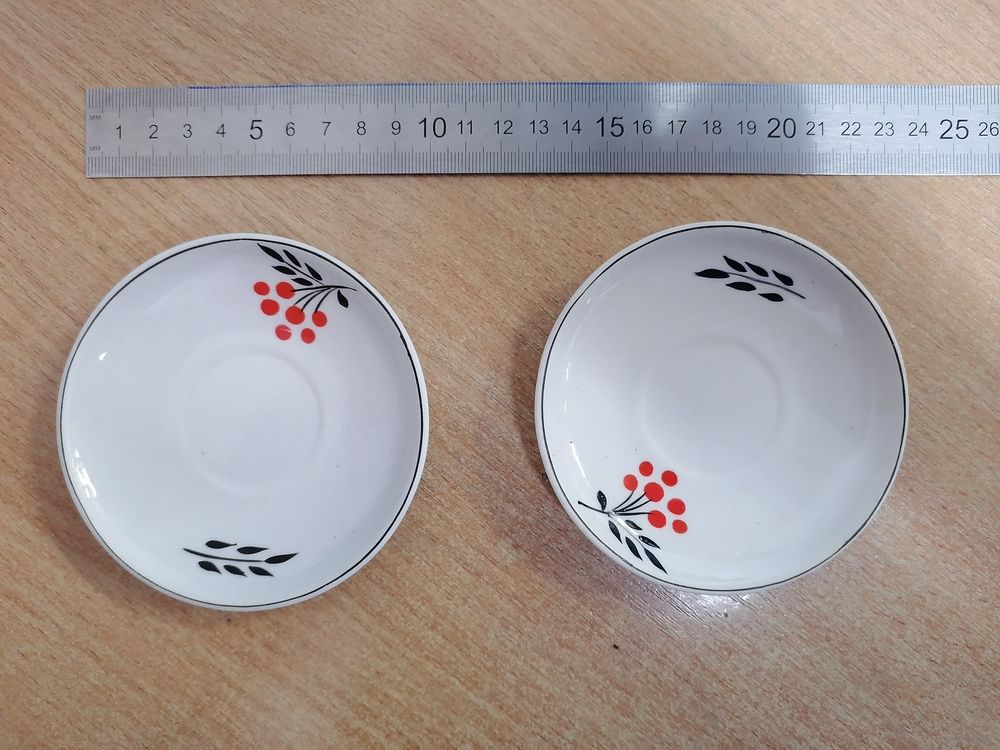 Продам два блюдца от детского чайного сервиза «Рябинка», производимого на подмосковном заводе «Гжель» с 1972 года. Диаметр блюдца – 10 см, клейм нет, детские сервизы не клеймили. Блюдца без дефектов. Могу подарить два блюдца со сколами.