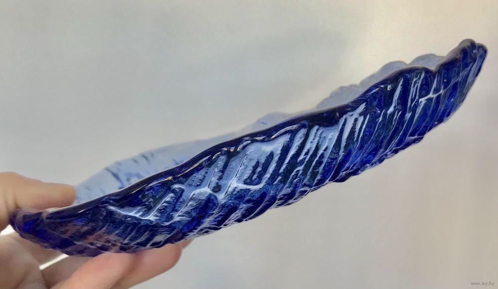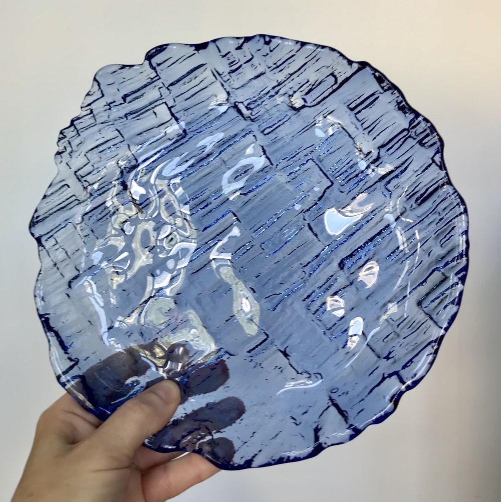 Блюдо из цветного стекла в гутной технике, прокатное моллирование автор В.Мурахвер. Неман 1970-е гг. Высота от 3-х до 4-х см., диаметр 23см. Тяжеленькое. Состояние хорошее.