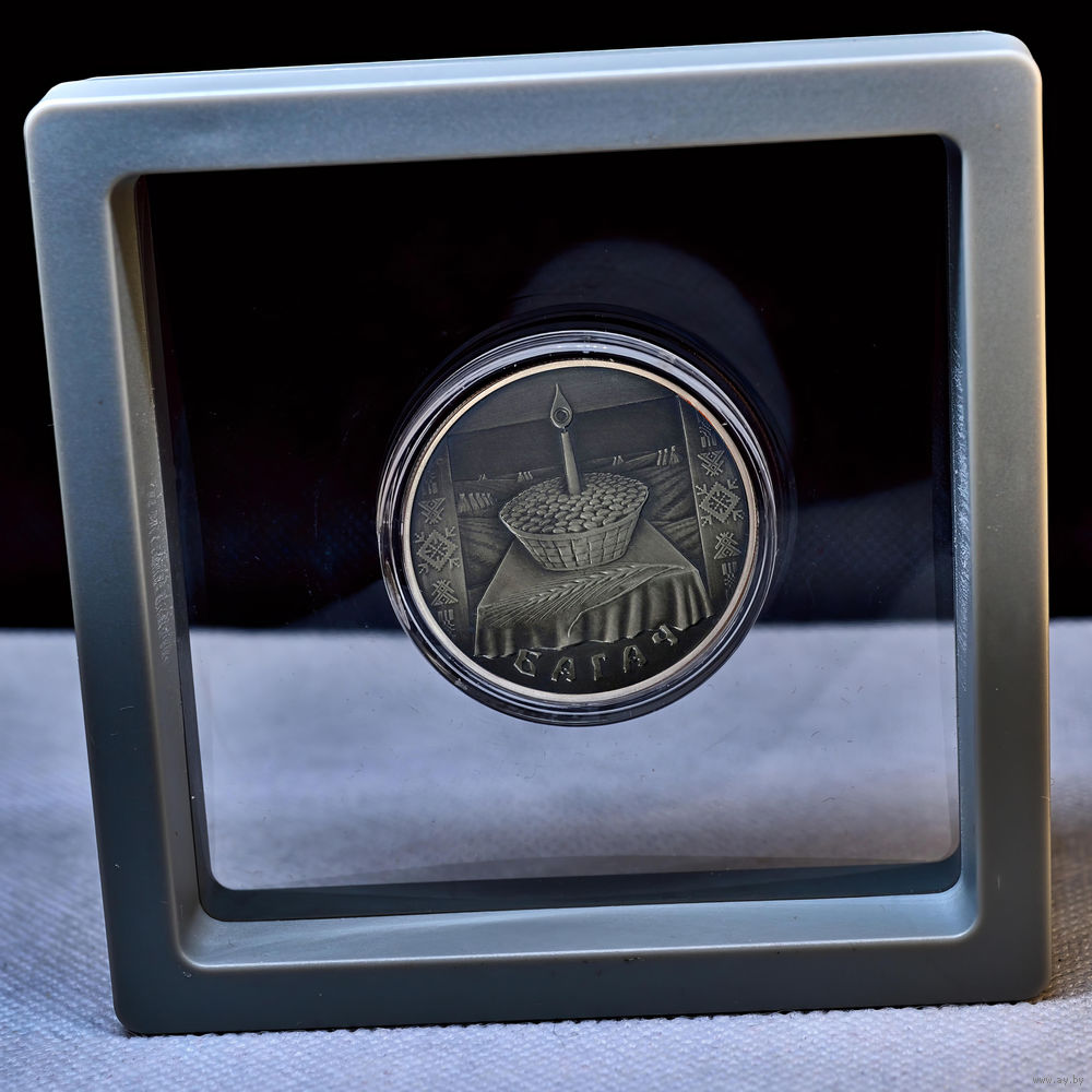Интересный факт. В Беларуси несколько лет назад была выпущена памятная монета, посвященная народному празднику “Багач”. На ней изображена обрядовая миска с зерном и зажженной свечой. Миска помещена на фоне поля и национального белорусского орнамента и рушника.