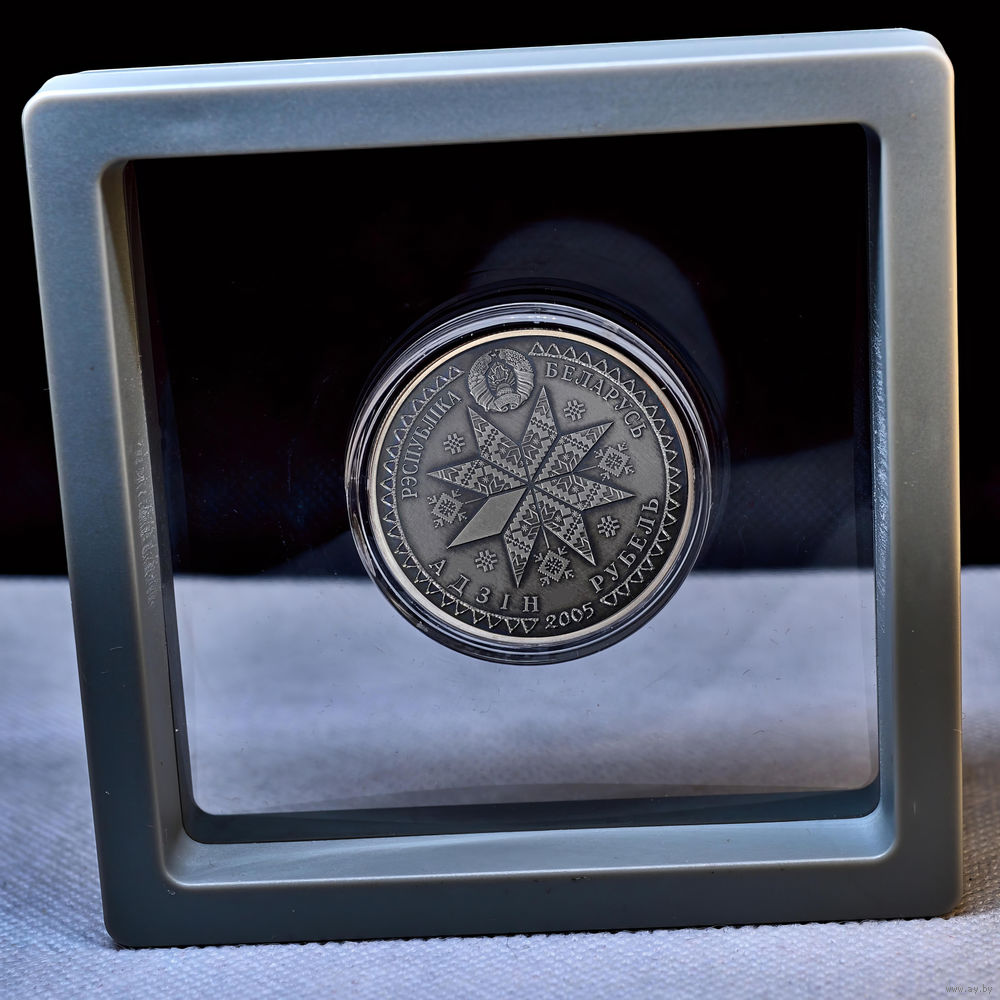 в круге, обрамленном геометрическим орнаментом, – рельефное изображение Государственного герба Республики Беларусь; в центре – солярный знак, состоящий из восьмиконечной геометрической фигуры с элементами ромбического декора, символизирующий солнечные лучи; под ним указаны: год чеканки, для серебряной – проба сплава; по кругу надписи: в верхней части – "РЭСПУБЛIКА БЕЛАРУСЬ", в нижней – "ДВАЦЦАЦЬ РУБЛЁЎ" на серебряной и "АДЗIН РУБЕЛЬ" – на медно–никелевой.