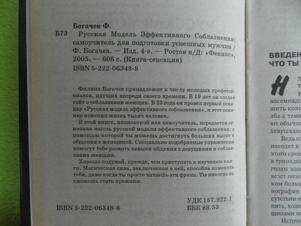 Филипп Богачев принадлежит к числу молодых профессионалов, идущих впереди своего времени. В 19 лет он создал сайт о соблазнении женщин. В 23 года он провел первый семинар Русская модель эффективного соблазнения, и этот семинар изменил жизнь тысяч человек. В этой книге, написанной как самоучитель, передается основная мысль русской модели эффективного соблазнения, с помощью которой ты можешь достигнуть больших высот в общении с женщиной. Специально подобранные упражнения помогут тебе развить навыки общения с девушками и соблазнения женщин. Хорошо подумай, прежде, чем приступать к изучению книги. Магическая сила, заключенная в ней, способна изменить тебя, даже когда ты просто читаешь эти фразы. Ты никогда не сможешь стать прежним.