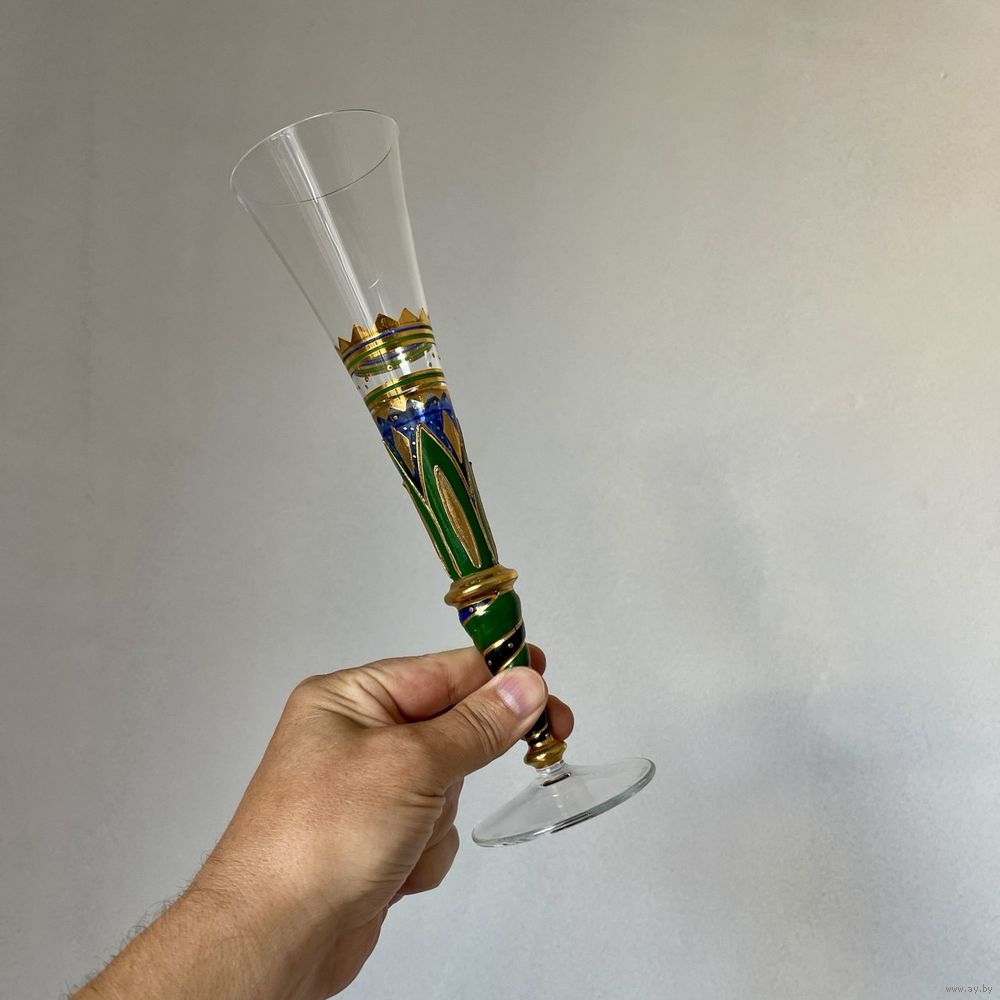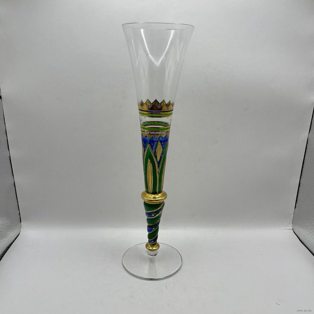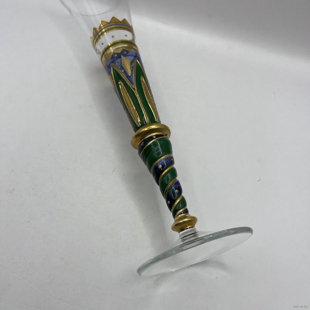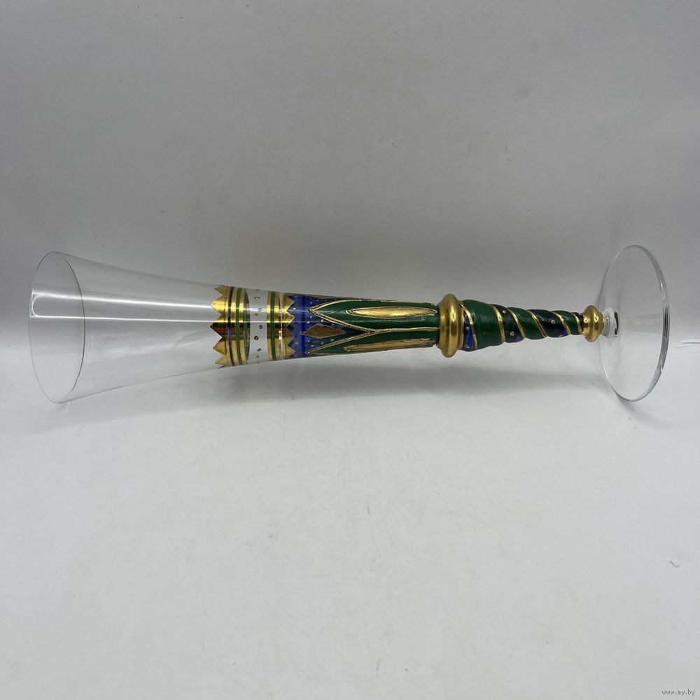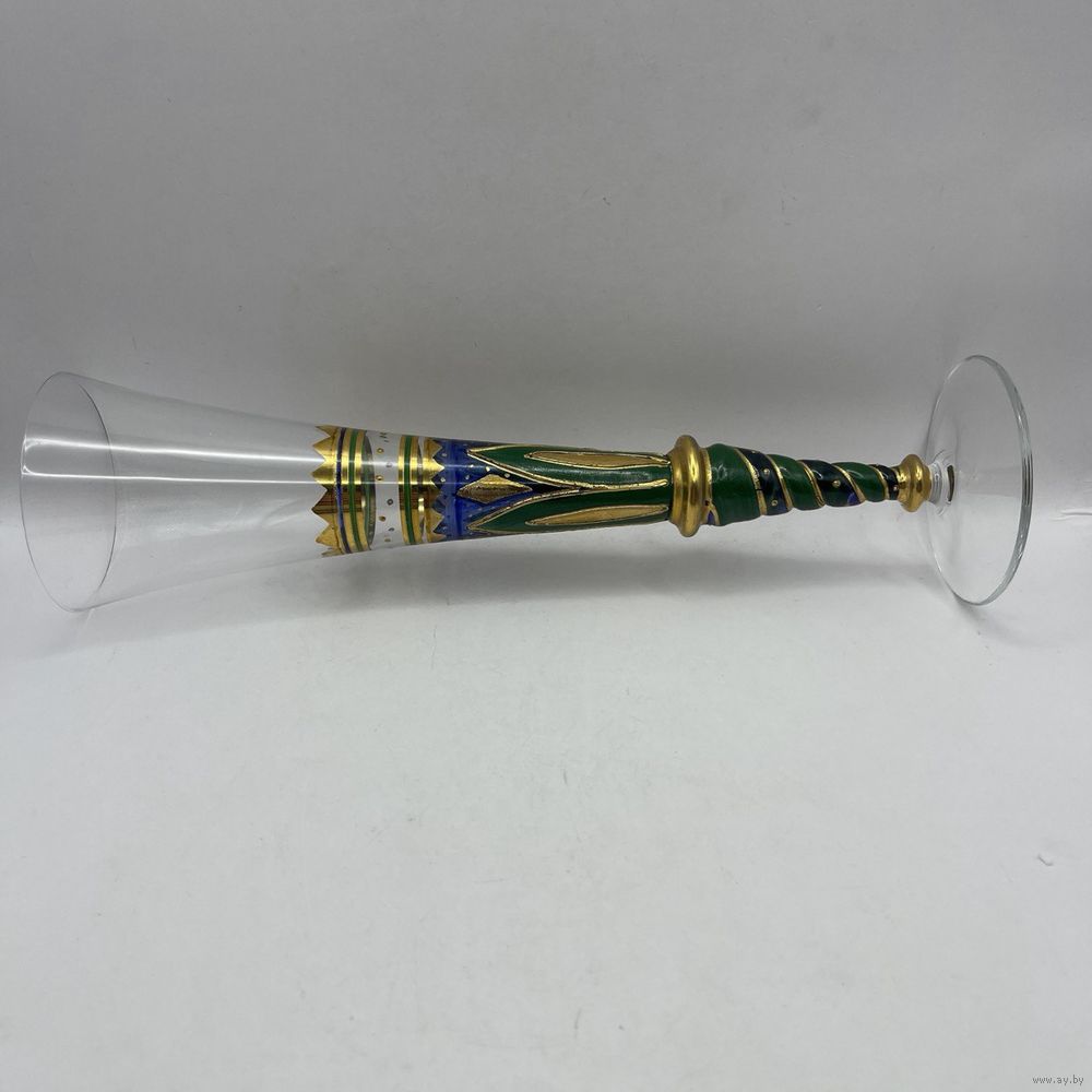 Антикварный высокий бокал в стиле барокко из выдувного венецианского стекла ручной работы с объемной ручной росписью и декором 23К золотом. Италия. 1950-е г.г. Высота 26,5 см, объем 200 мл.