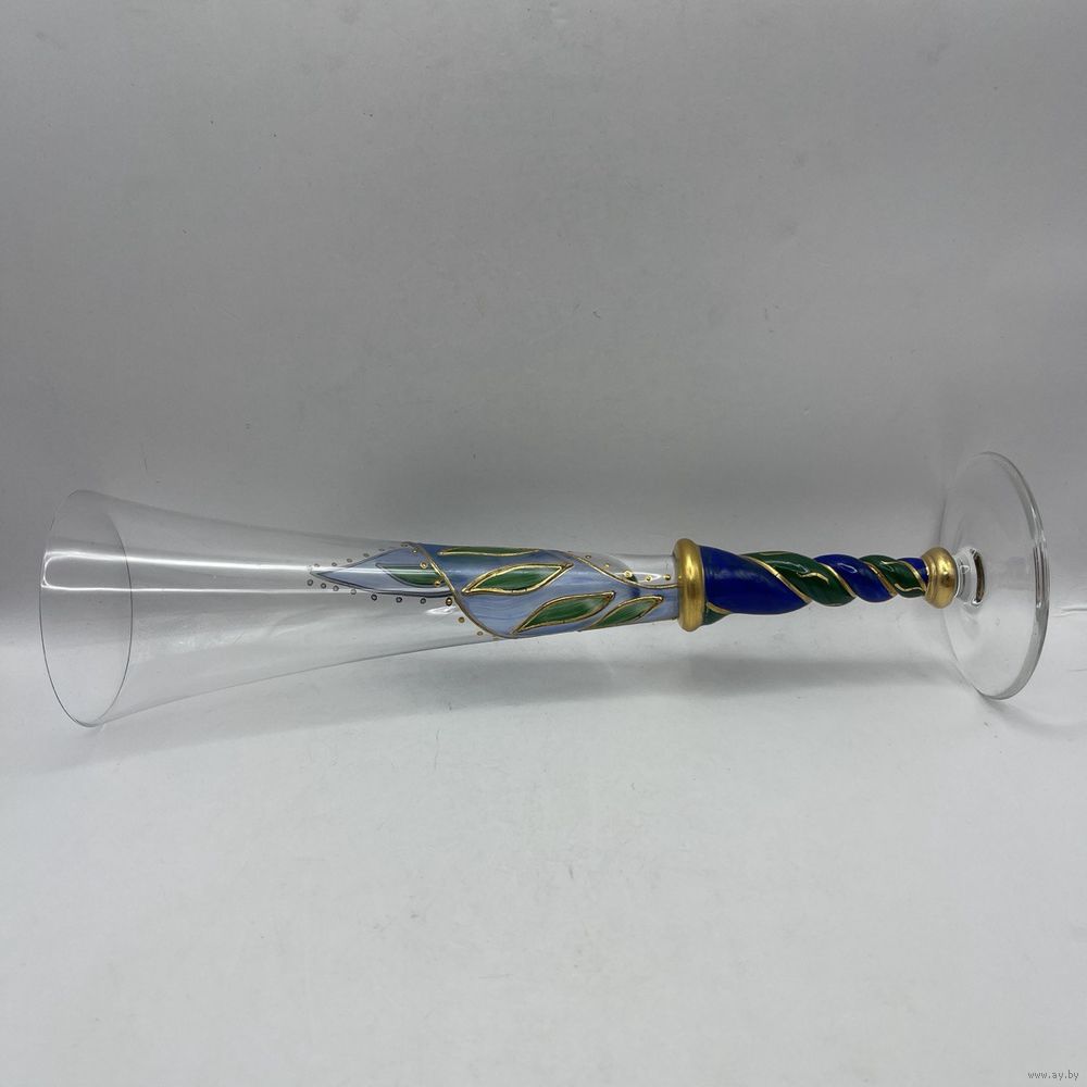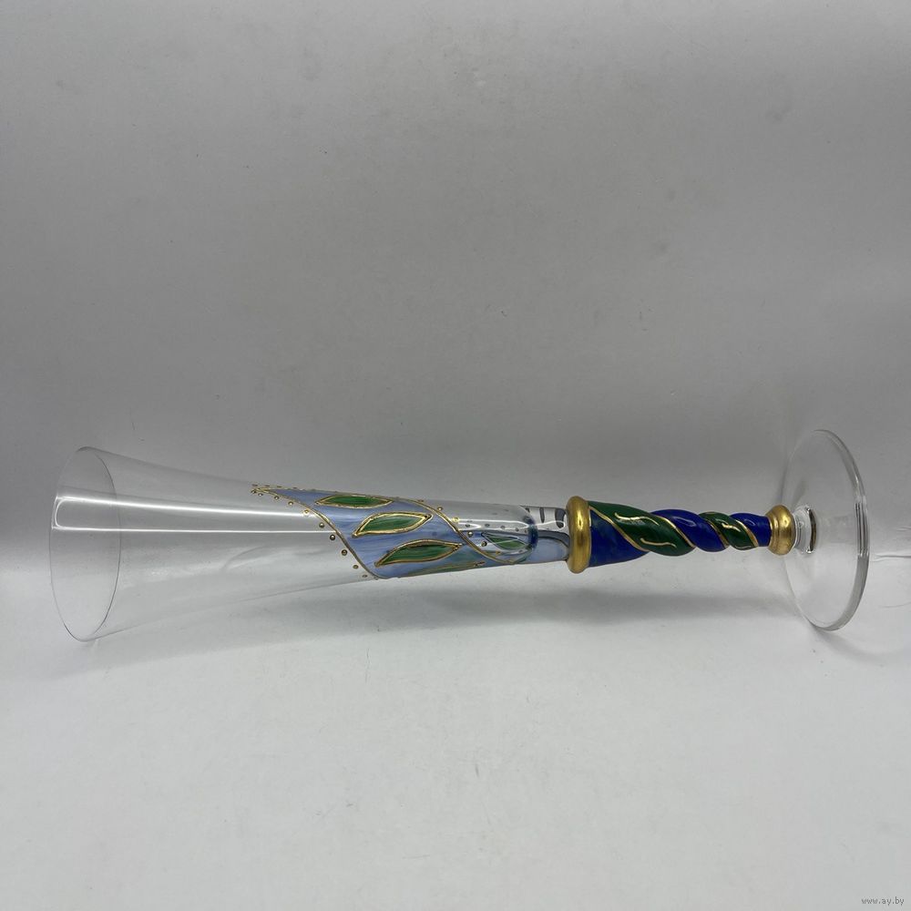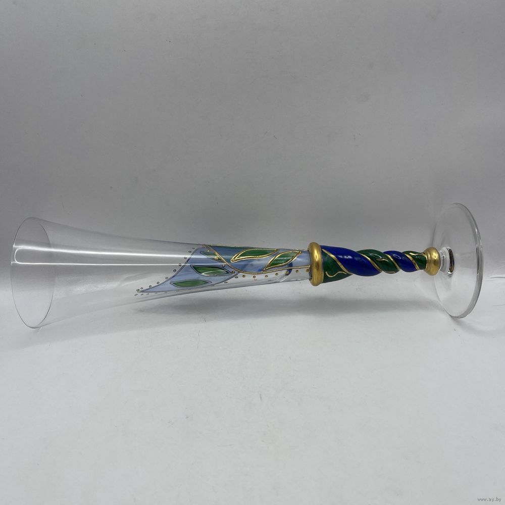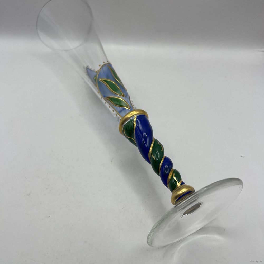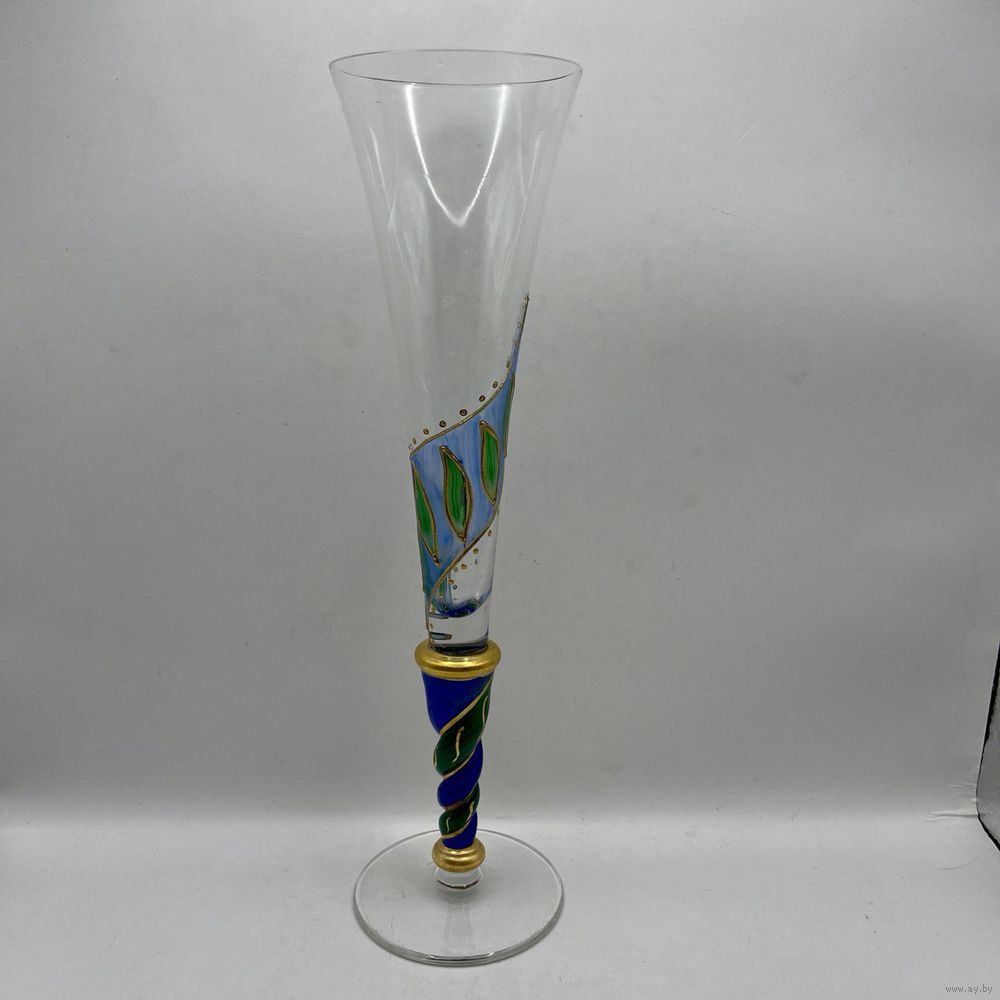 Антикварный высокий бокал в стиле барокко из выдувного венецианского стекла ручной работы с объемной ручной росписью и декором 23К золотом. Италия. 1950-е г.г. Высота 26,5 см, объем 200 мл.