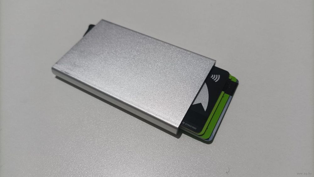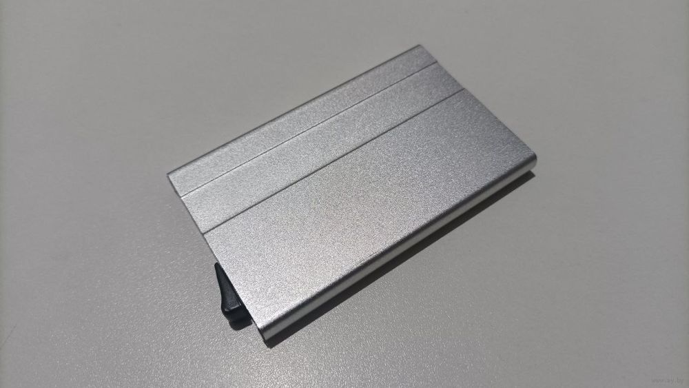 Алюминевый. Влазит 5 банковских карт, достаются одним нажатием.