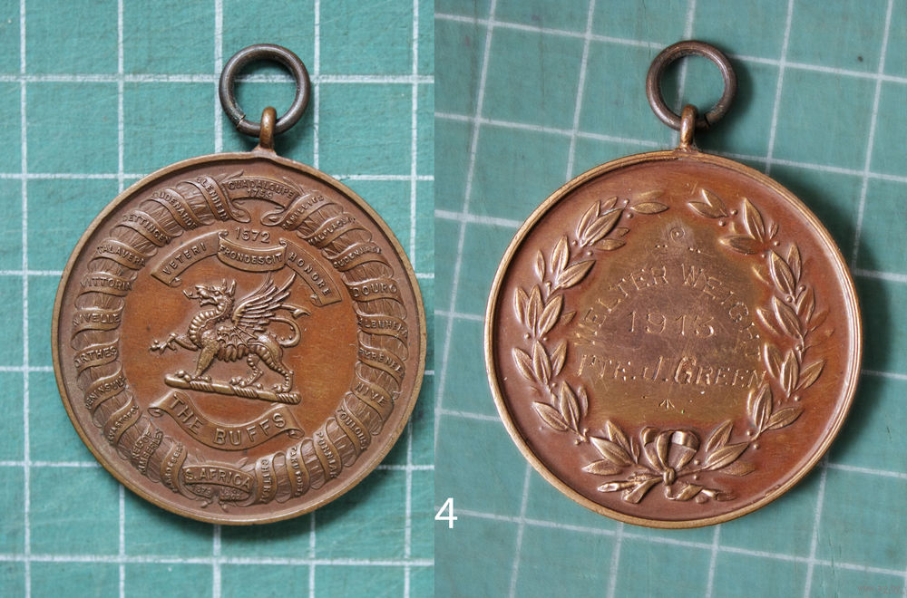 Очень красивая медаль победителя соревнований в полусреднем весе среди военнослужащих британского королевского полка (The BUFFS) в 1913 г. Прекрасная детализация, гравировка, красивая красноватая патина.