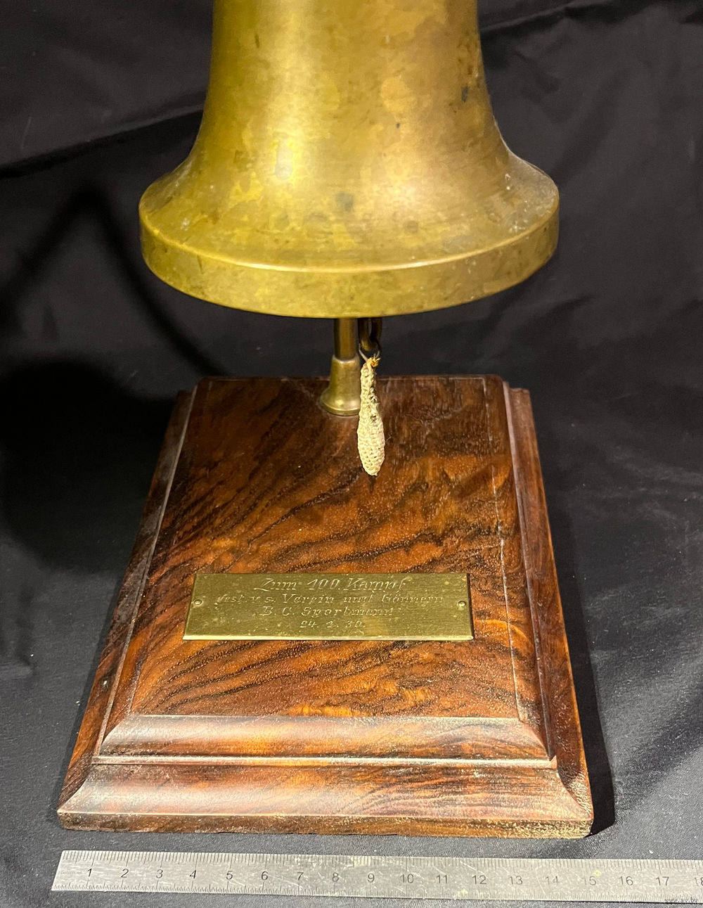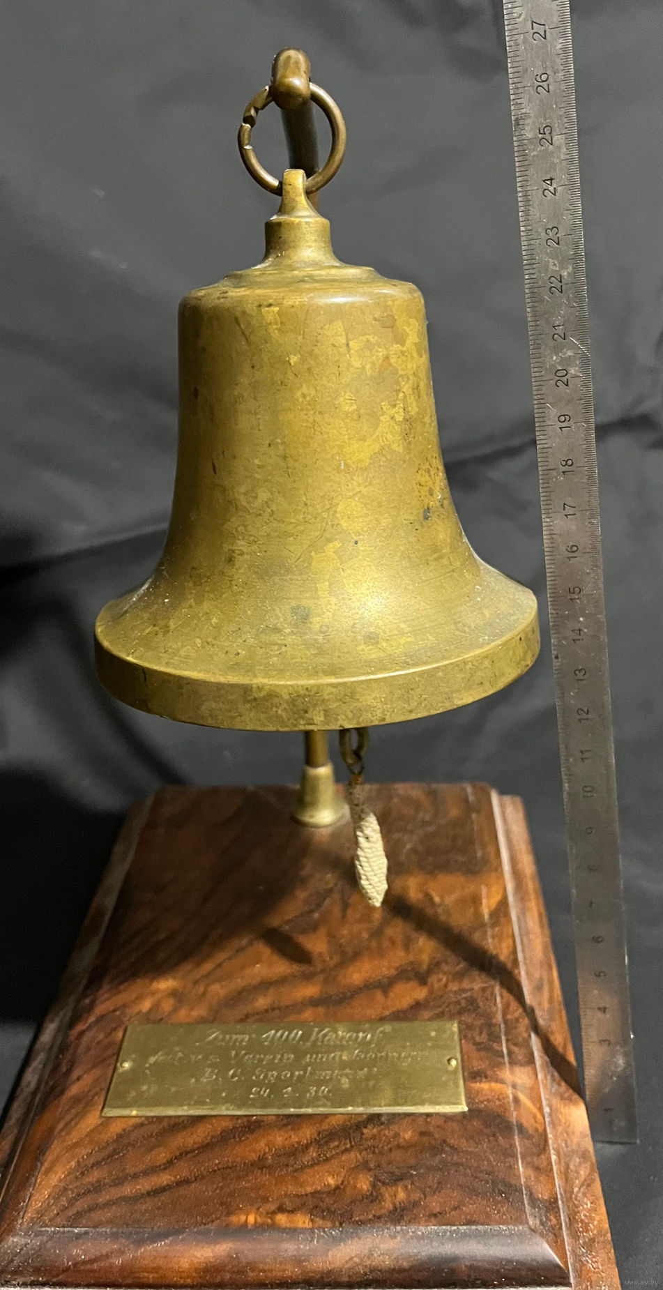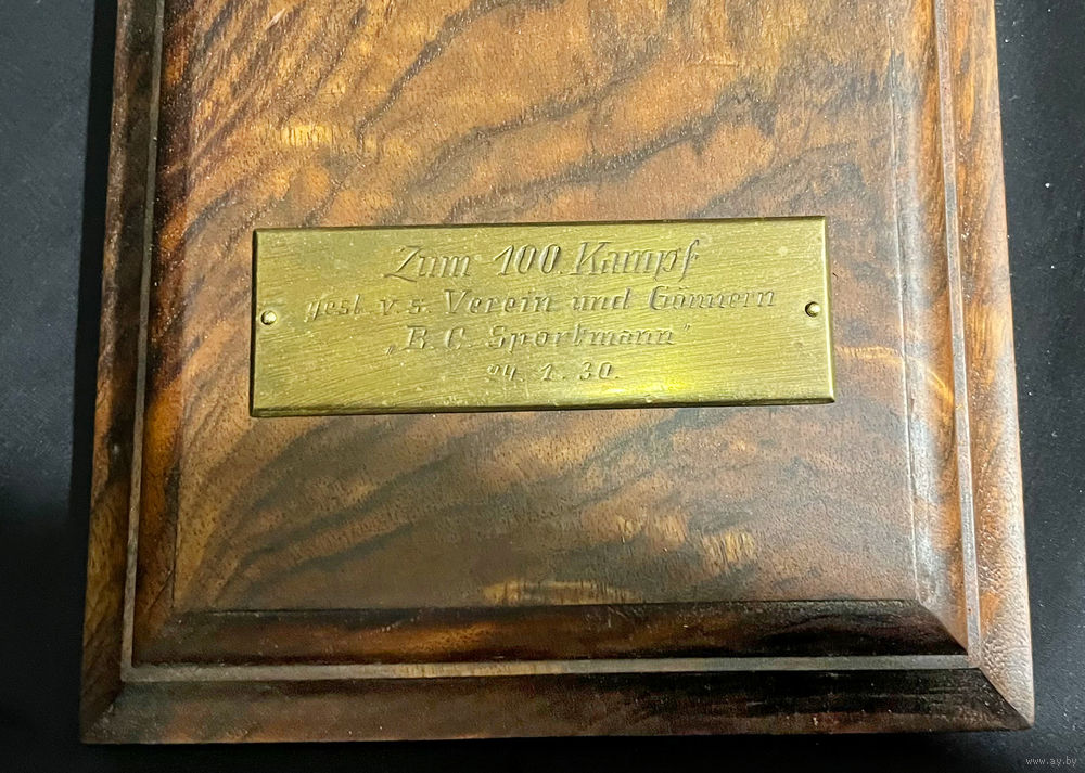 Уникальный настольный боксерский гонг с красивой деревянной базой. На шильде дарственная подпись. С переводом не уверен, но что-то вроде «К сотому поединку от Клуба и покровителей. БК Sportmann 24-01-1930».