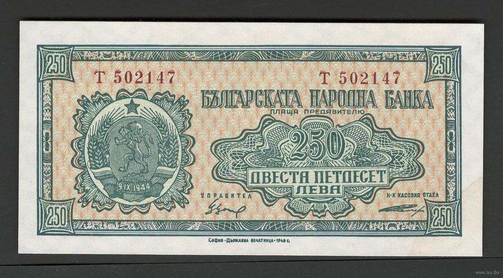 Болгария 250 лева 1944 года. Тип P-76. Состояние aUNC