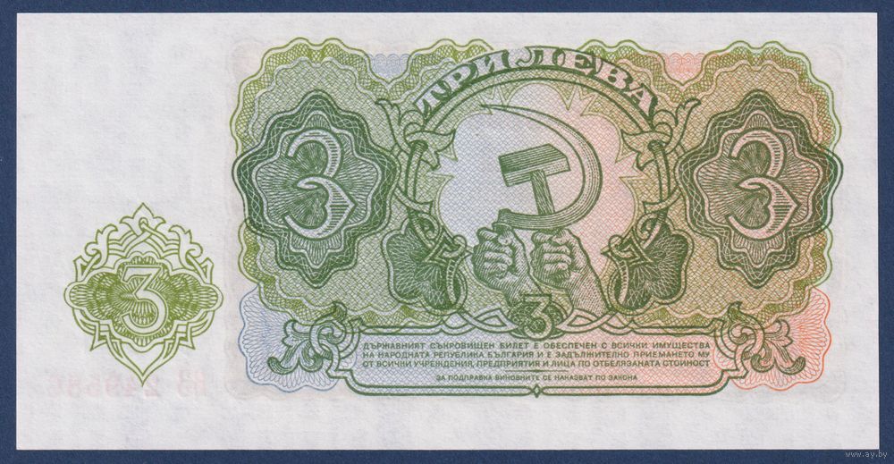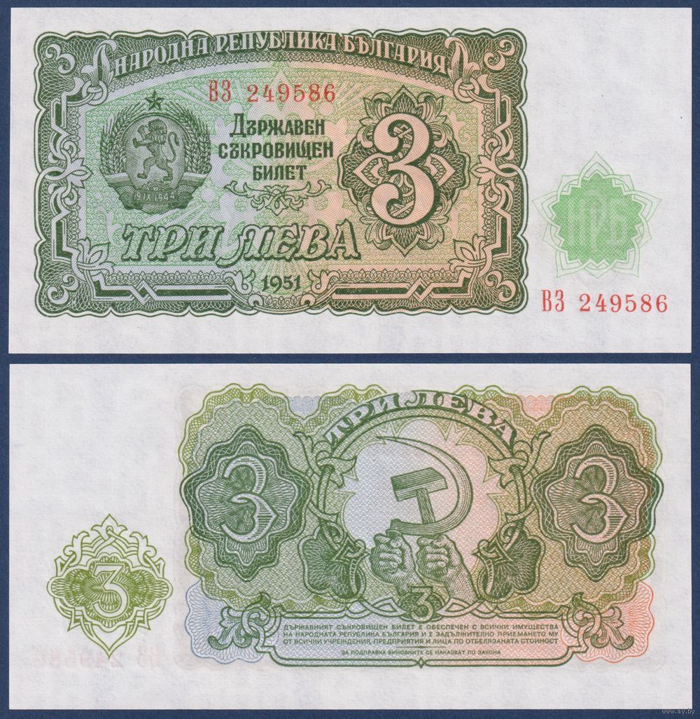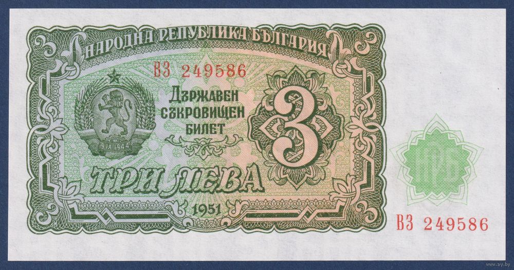 Болгария, 3 лева 1951 г., P-81 (ВЗ, герб, серп и молот), UNC