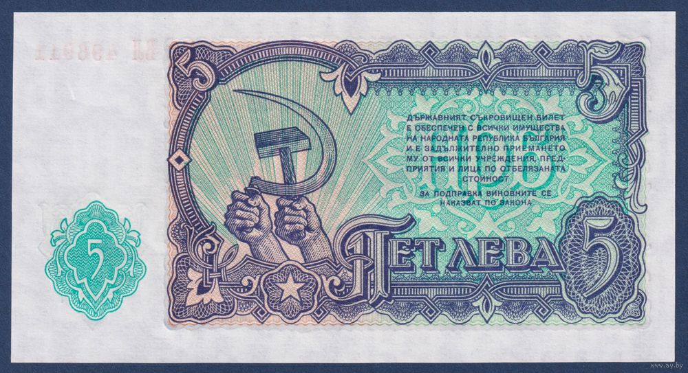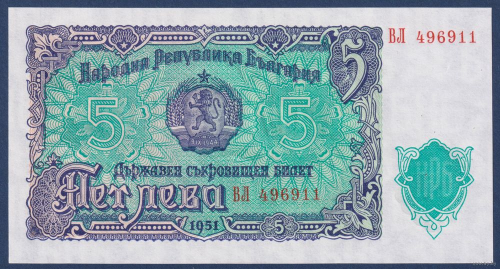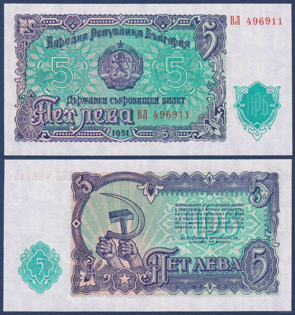 Болгария, 5 лева 1951 г., P-82 (ВЛ, герб, серп и молот), UNC