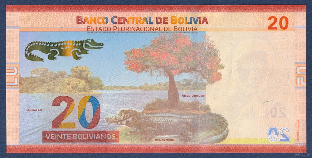 Боливия, 20 боливиано 2018 г, P-249(2-1) (A, IBNS 2018, крепость Самайпата, черный кайман), UNC