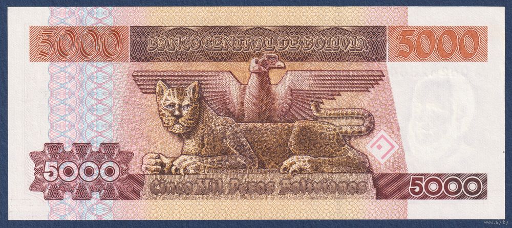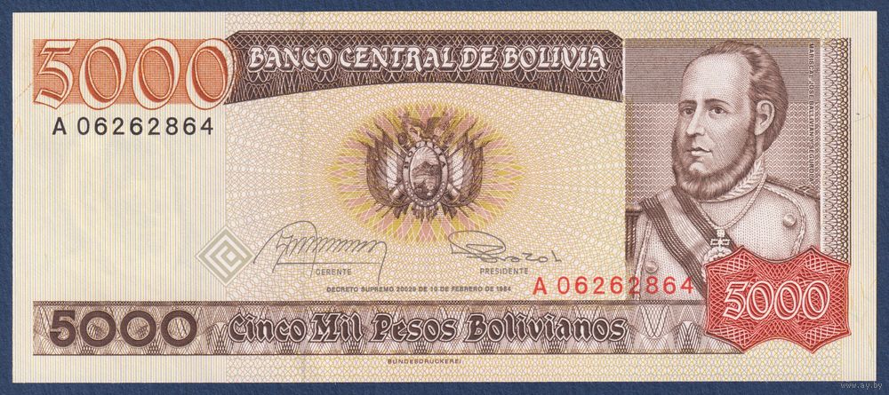 Боливия, 5000 боливаров 1984 г., P-168a(1) (A, генерал Хосе Бальивиан и Сегурола, леопард), UNC