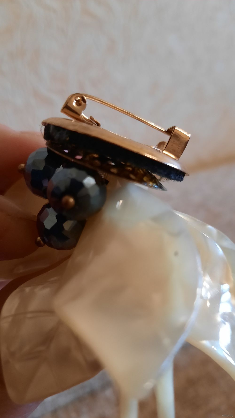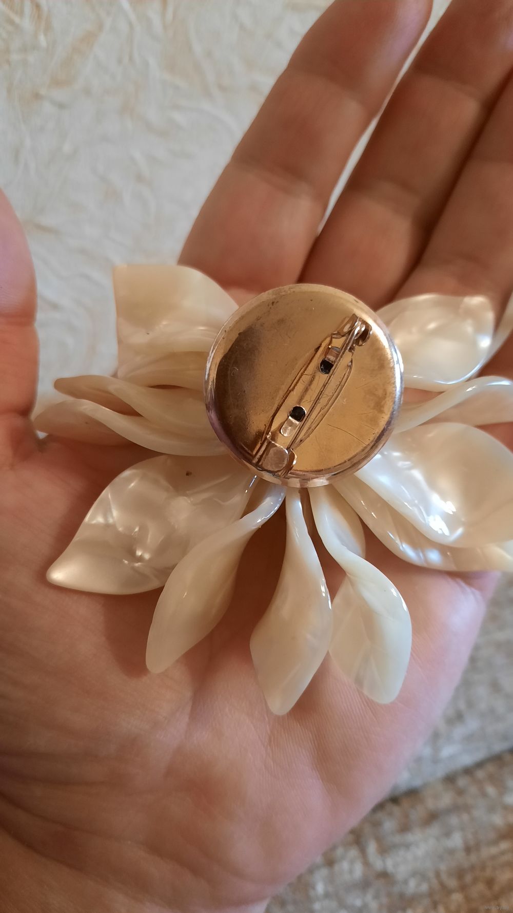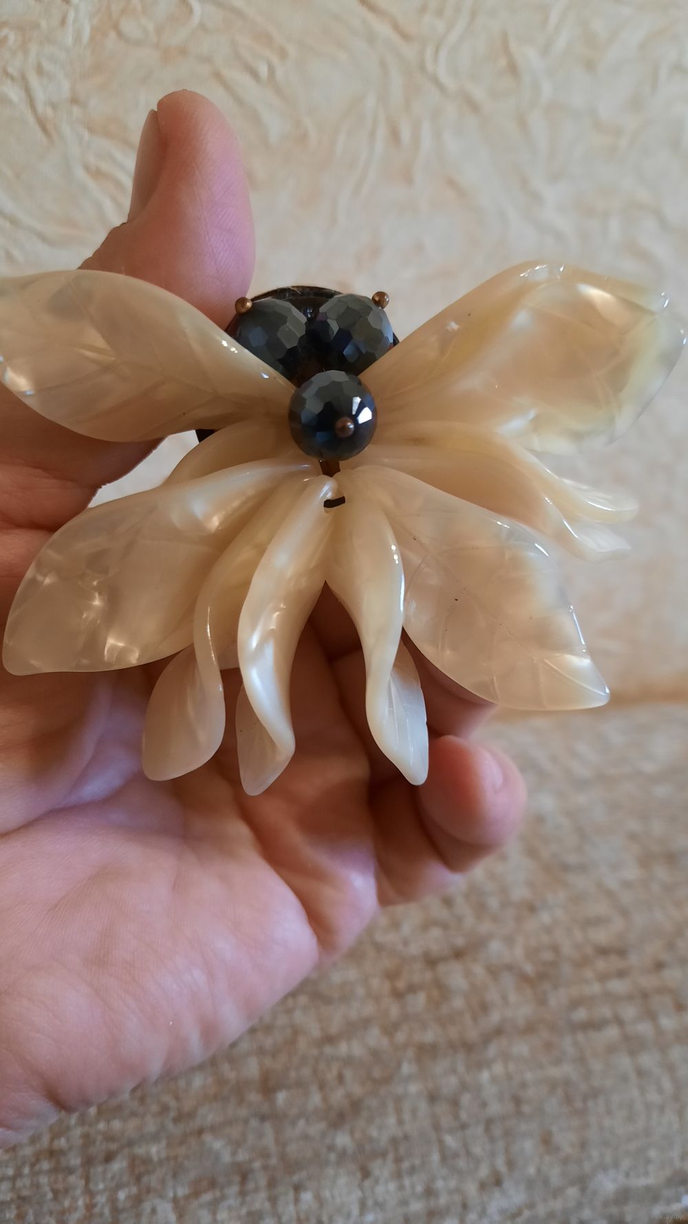 Год неизвестен , лепестки перламутровые, бусины граненые отдают синим блеском. Не видела, чтобы ее одевали, поэтому неизвестно, лежала с другими вещами, которым много лет. Очень большая.