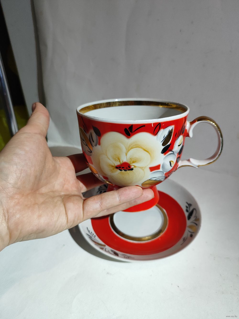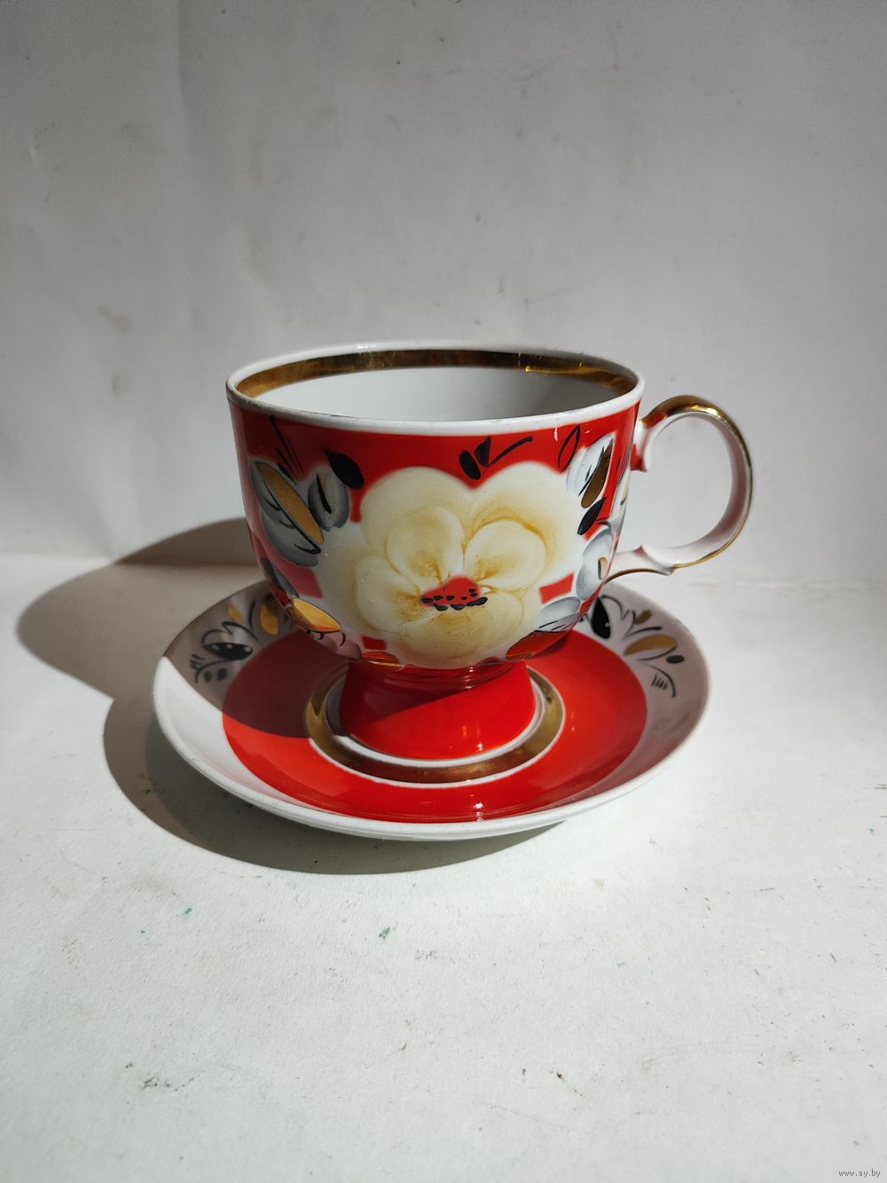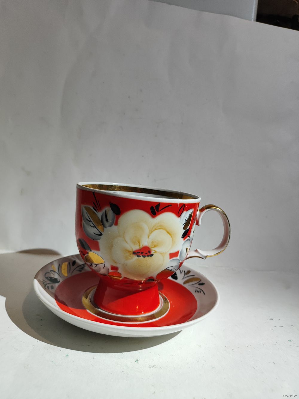 Целая . Редкая чайная пара. Высота чашки -11 см. Диаметр блюдца-17 см. Состояние на фото(небольшие потёртости позолоты (на ручке)и на красной краске).