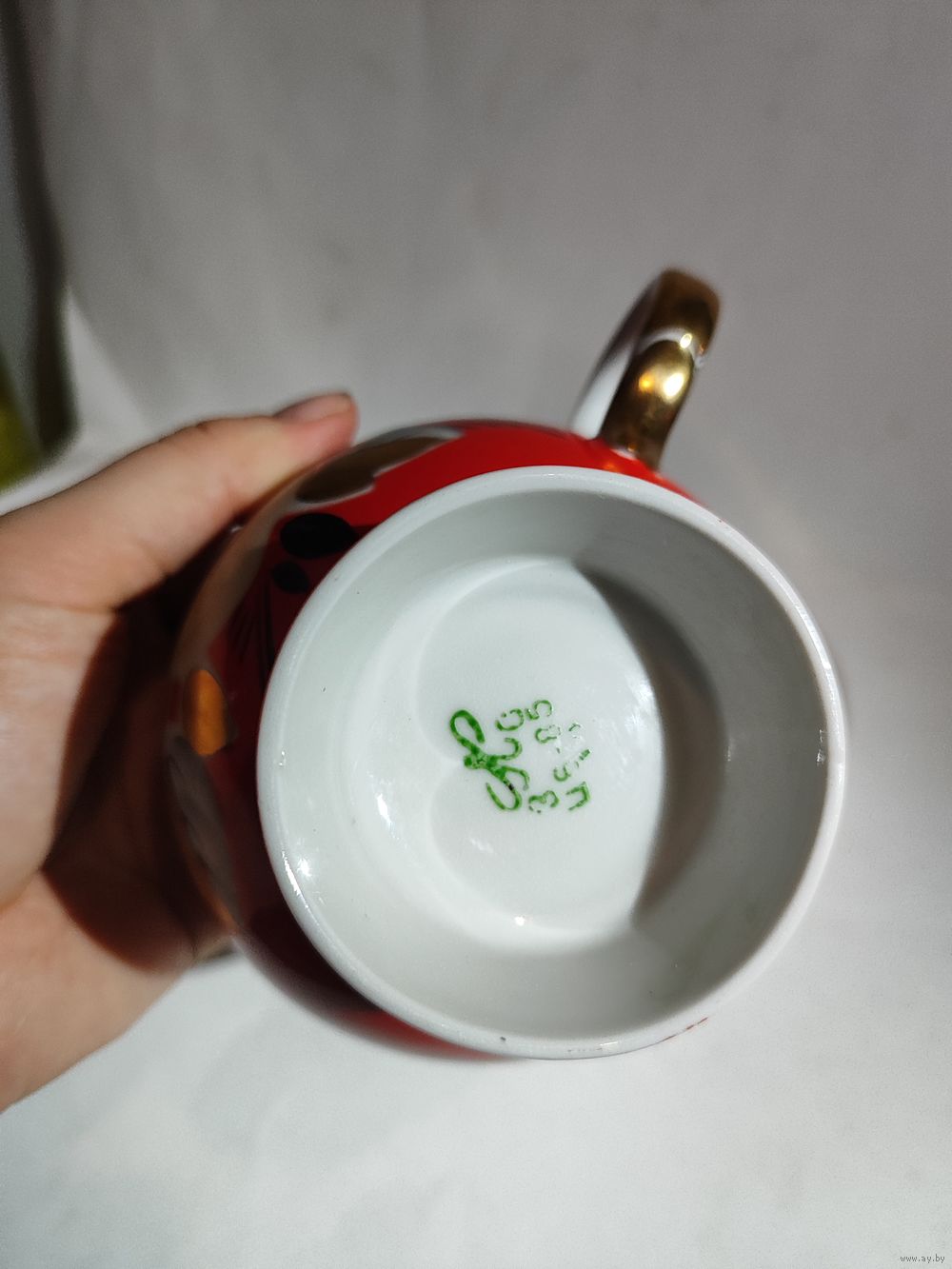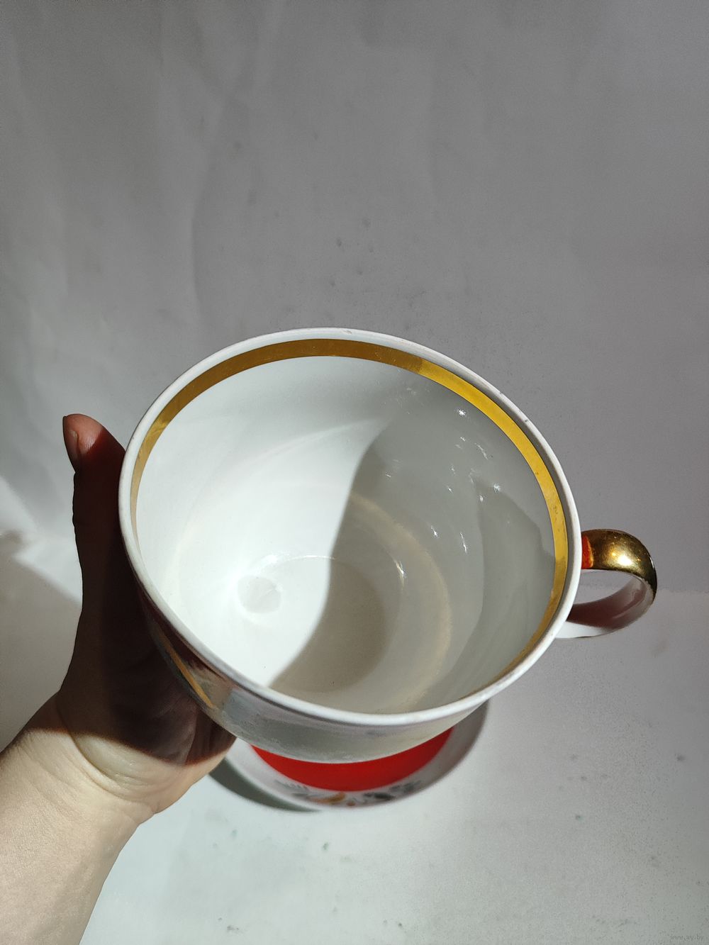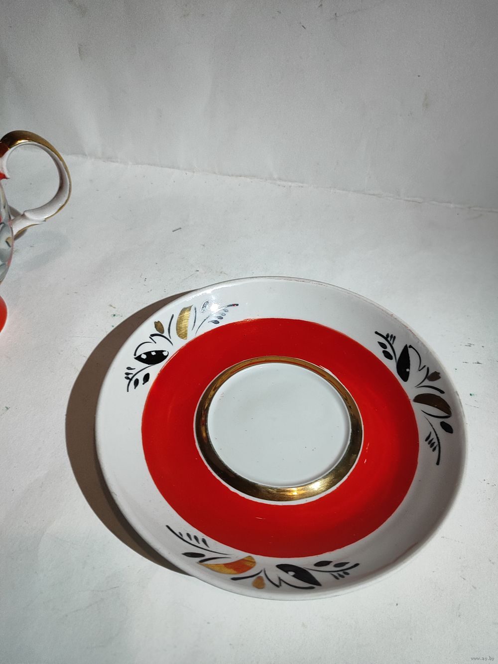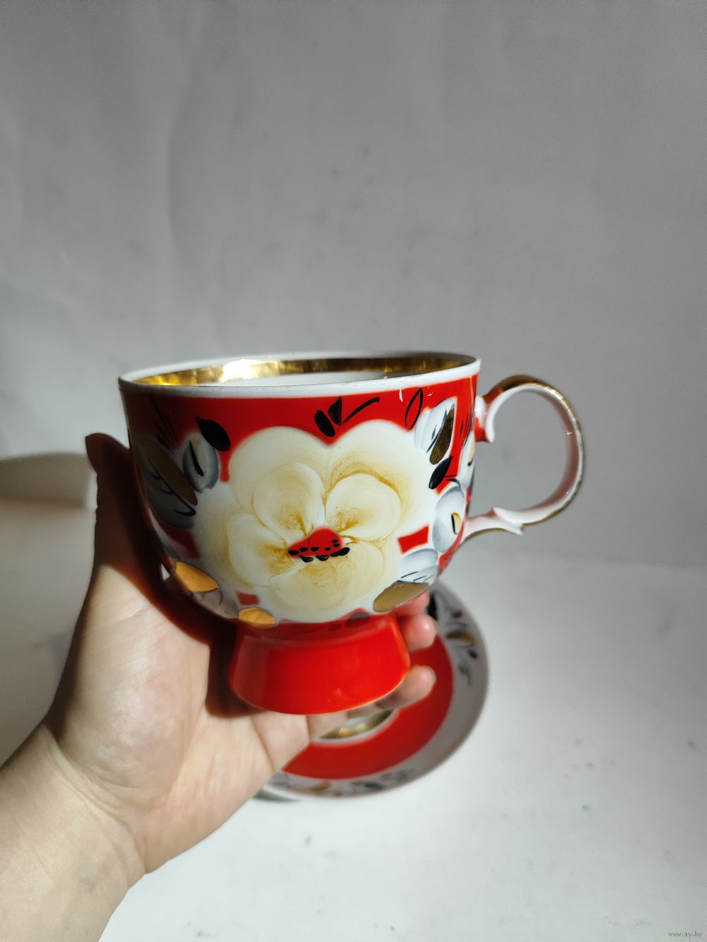 Целая . Редкая чайная пара. Высота чашки -11 см. Диаметр блюдца-17 см. Состояние на фото(небольшие потёртости позолоты (на ручке)и на красной краске).