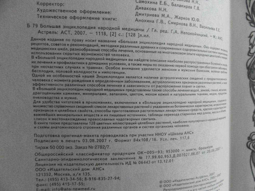 Данное издание по праву носит название «Большая энциклопедия народной медицины». Оно содержит множество рецептов, советов и рекомендаций, методики различных древних и современных оздоровительных систем и национальных медицинских школ, разнообразные способы лечения, основанные на многовековом опыте народных целителей и знахарей, использовании скрытых возможностей человека. В «Большой энциклопедии народной медицины» вы найдете описание наиболее распространенных болезней и способы их лечения и профилактики в домашних условиях, а также меры по оказанию первой помощи при обострении заболеваний, при несчастных случаях и травмах. Особое внимание уделяется женским и мужским болезням, включая проблемы бесплодия, половой холодности и импотенции. Одной их особенностей Энциклопедии является наличие астрологических сведений о предрасположенности человека с момента рождения к определенным заболеваниям, астрологических признаков различных растений, а также эффективности различных способов лечения в зависимости от расположения планет и светил. В «Большой энциклопедии народной медицины» представлены также способы лечения водой, землей, глиной, металлами, драгоценными камнями, минералами, запахами, цветом, мехом кожей и натуральными тканями, медом, продуктами пчеловодства и мумие. Для удобства читателей в приложениях, включенных в «Большую энциклопедию народной медицины», содержится множество справочных сведений: список лекарственных растений с указанием их ботанических характеристик, астрологических признаков и целебных свойств, способы приготовления растительных лекарственных средств, краткие характеристики важнейших минеральных веществ и их пищевые источники, таблицы перевода старинных мер длины, массы и объема, список и местонахождение православных чудотворных святынь. В книге также представлены 128 цветных иллюстраций целебных растений, наиболее популярных в народной медицине, и схемы анатомического строения различных органов и систем организма человека.