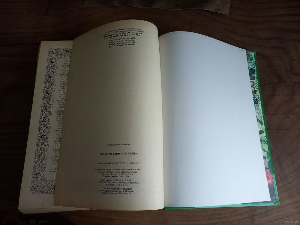 Книга большого формата "Большая книга дачника", 2003 год, издательство Минск Харвест. Содержит советы о размножении сортов, уход за культурами и другие полезные советы. Здесь содержатся рекомендации по агротехнике, выращивании овощей, о питании растений, способах защиты от вредителей и болезней, информация об обработке почвы, выборе семян, выращивании рассады. Также здесь вы найдете советы по сооружению русской бани,бани-сауны, походной бани и мини-сауны, технологии строительства погребов и колодцев.