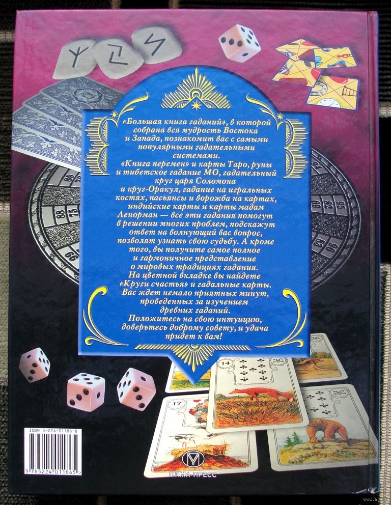 В книге собраны самые популярные гадательные системы, создававшиеся в течение столетий разными народами мира. Китайская `Книга перемен`, карты Таро, руны и тибетское гадание МО предоставят вам возможность заглянуть в будущее. С помощью `кругов счастья` иигральных костей вы узнаете свою судьбу. А карты мадам Ленорман и индийские карты помогут найти ответы на волнующие вас вопросы. На цветной вкладке представлены гадальные карты и `круги счастья`.
