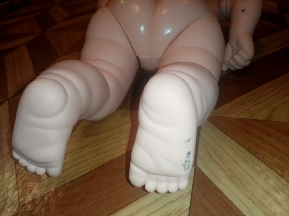 Большая кукла пупс в реалистичном исполнении в вельветовом сарафане. Ножки, ручки, подвижны, глаза закрываются. Имеются следы черного красителя, обычными средствами не оттирается. Более агрессивные средства не использовались, боясь повредить материал. Продается, как есть.