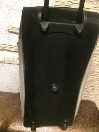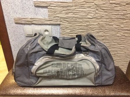 Большая спортивная сумка с выдвижной ручкой. Сумка очень большая и вместительная. Размер длина не меньше 60 см, ширина около 40 см. Сумка очень прочная, добротная. Единственное, необходимо вымыть, есть следы носки на ткани, но сумка целая.
