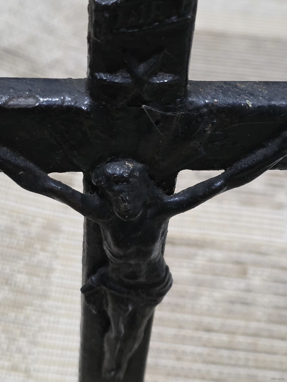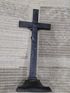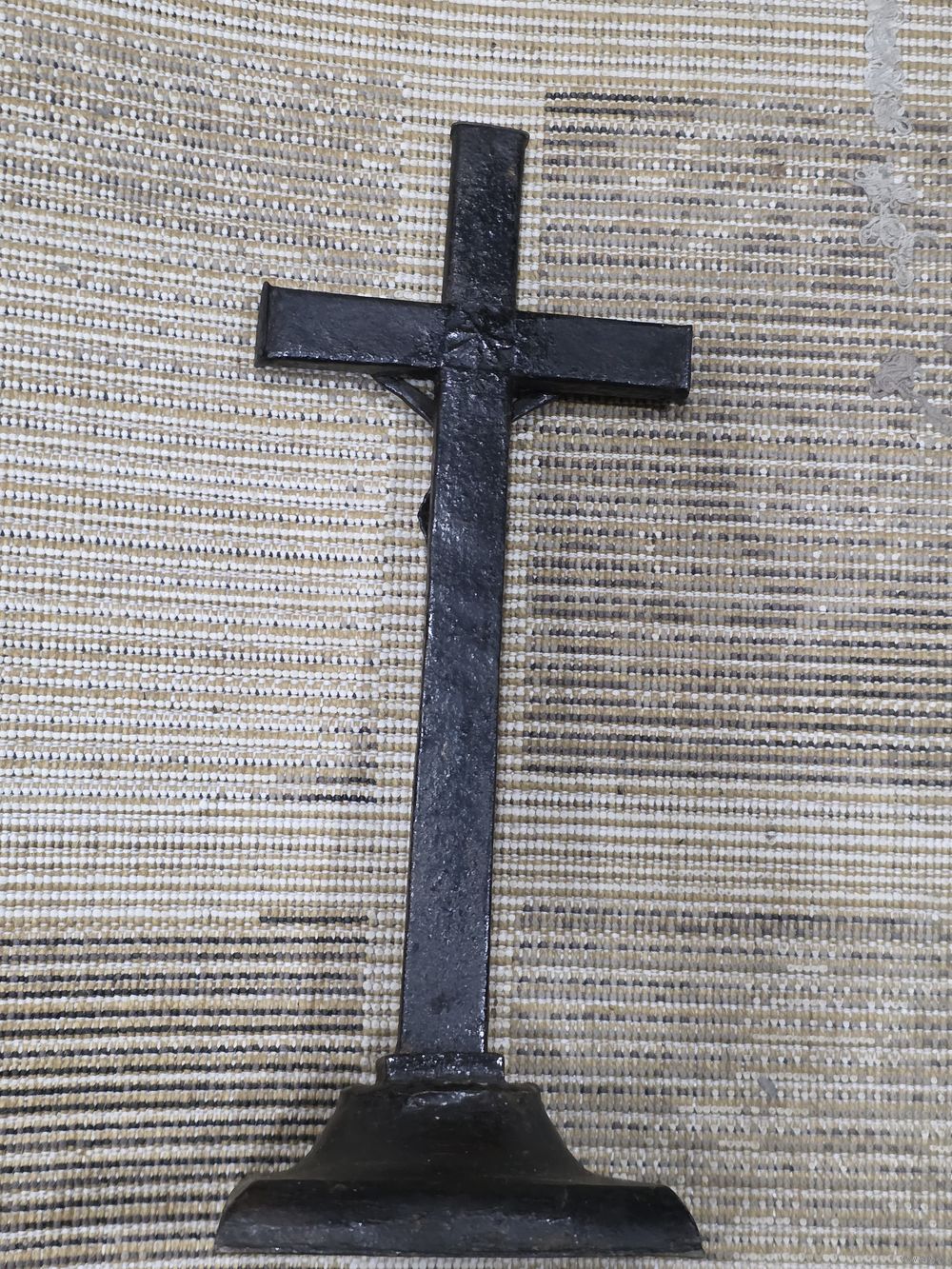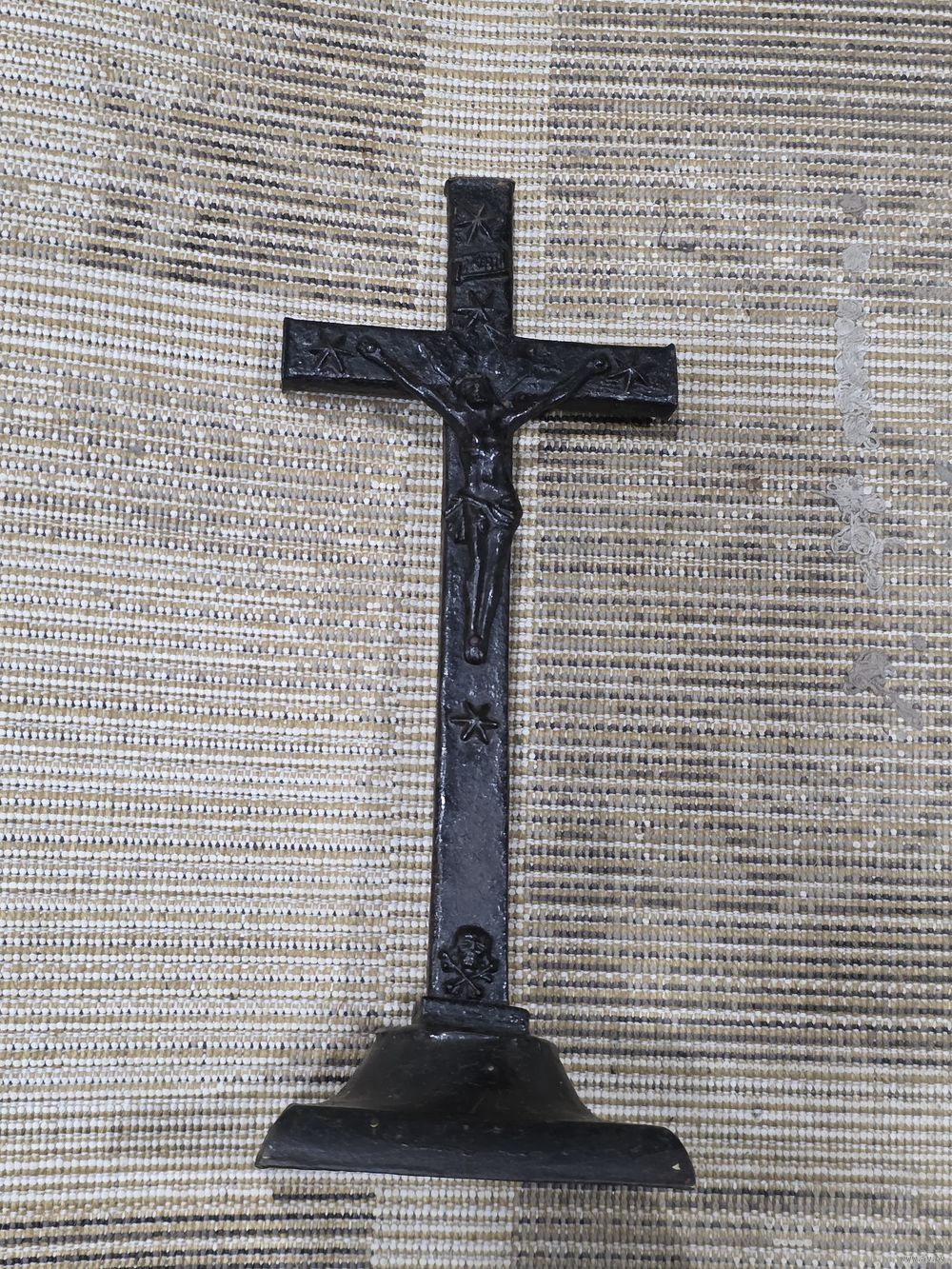 Высота 38 см, подставка 13×13,5 см, перекладина почти 15,5 см. Подставка из латуни( кусочек краски откололся-видна латунь). Возможно и крест из латуни.