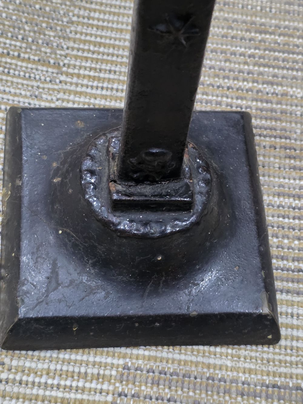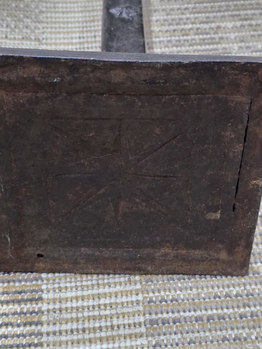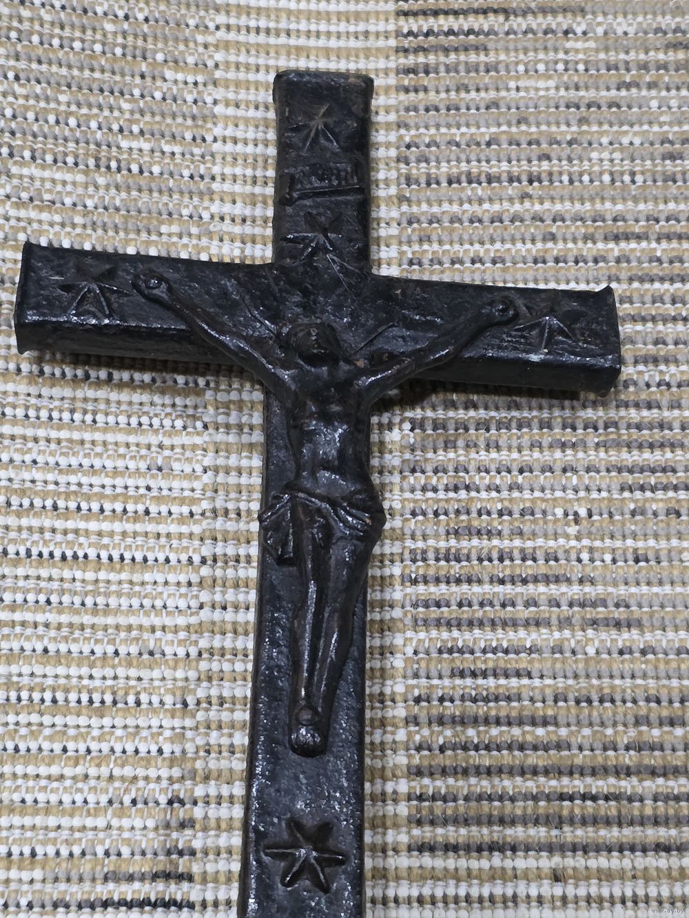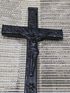 Высота 38 см, подставка 13×13,5 см, перекладина почти 15,5 см. Подставка из латуни( кусочек краски откололся-видна латунь). Возможно и крест из латуни.