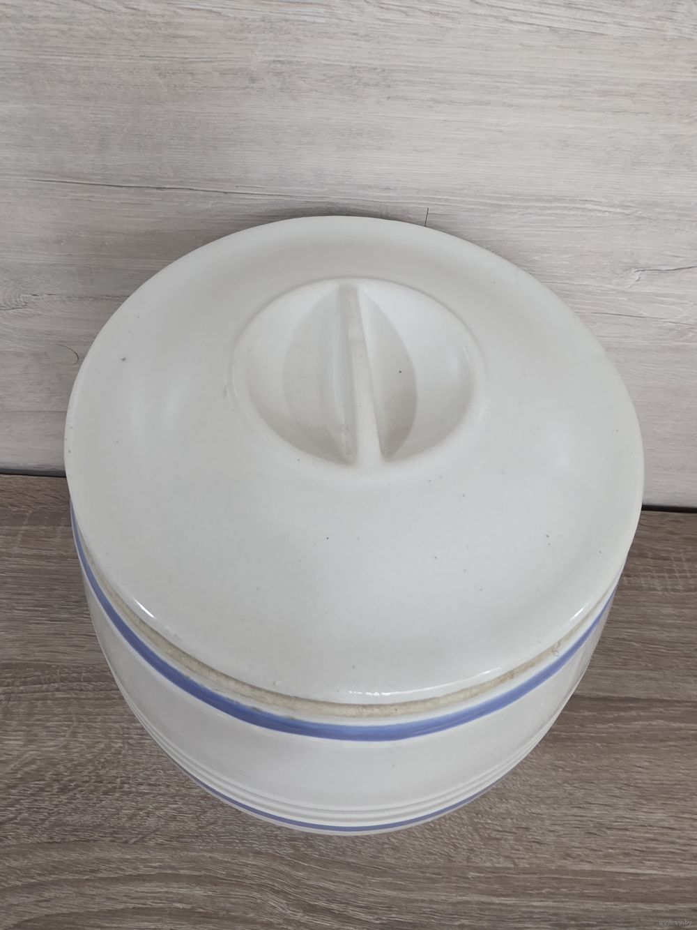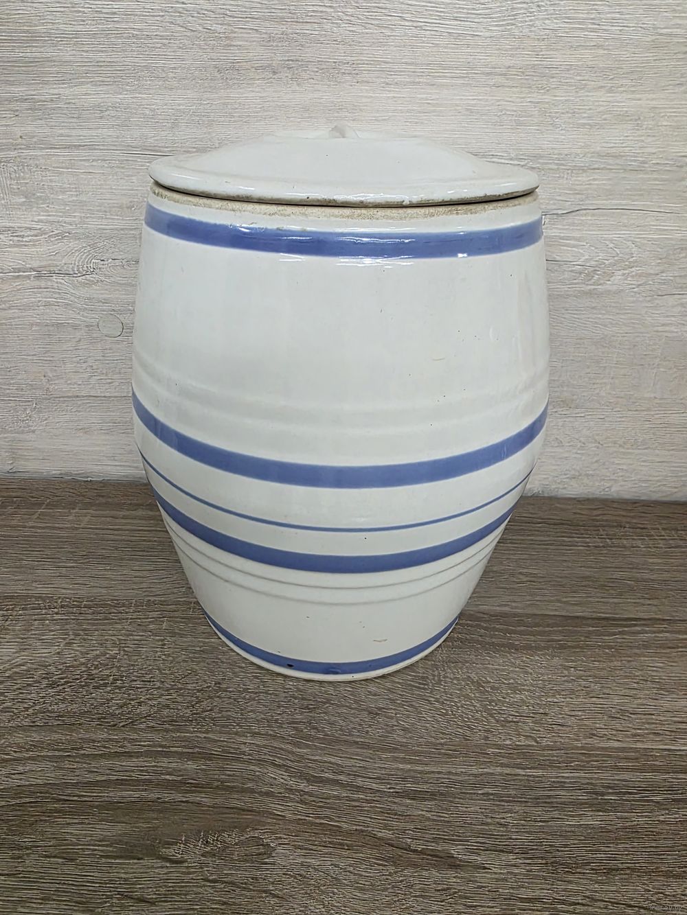 Высота с крышкой 30,5 см, без-27,5 см. Целый, только внизу скол. В середине-24 см ширина. Крышка 20,5 см наружка. Подойдёт под соленья, мёд.