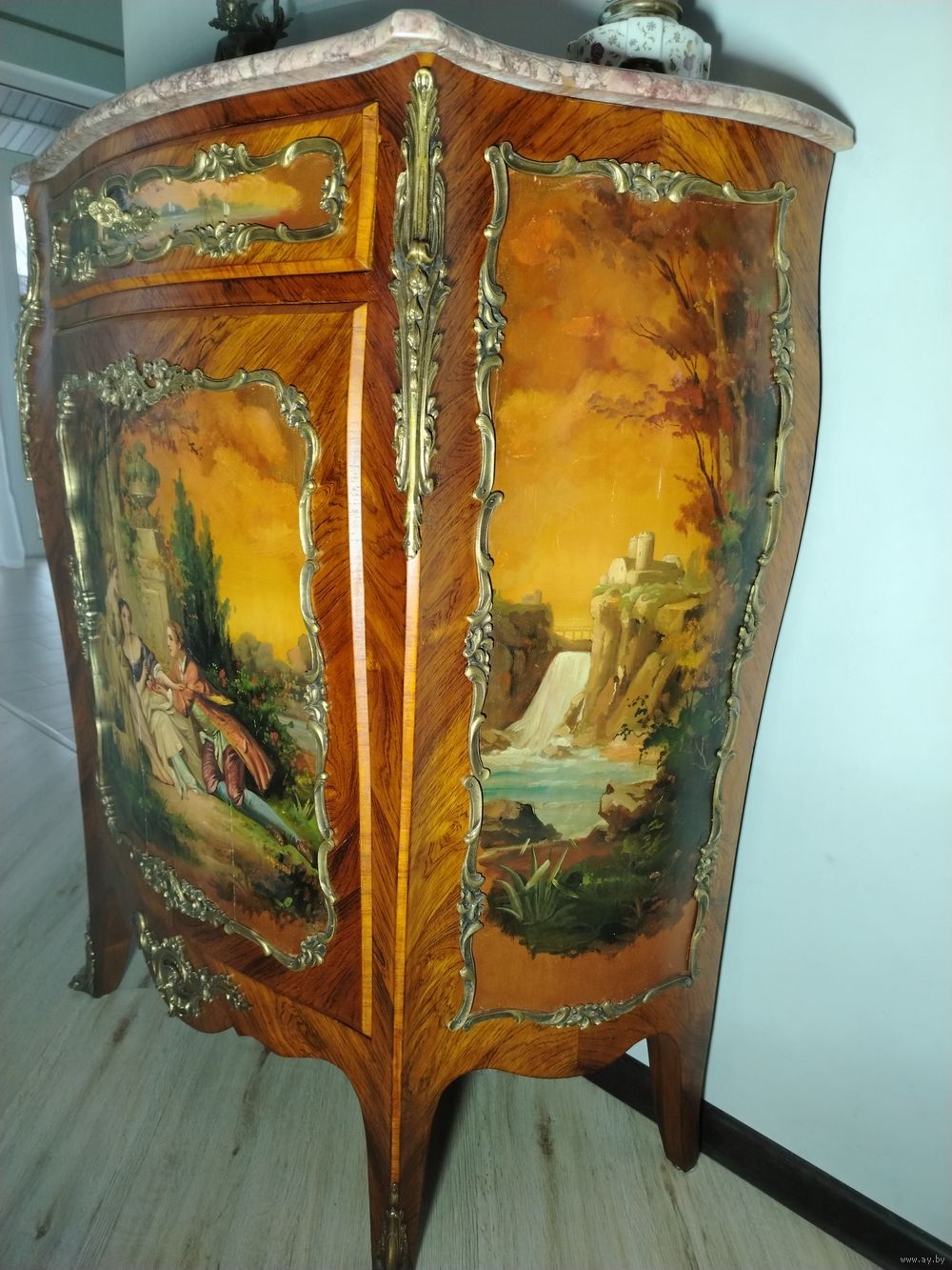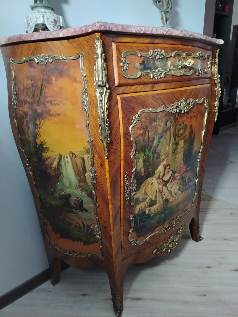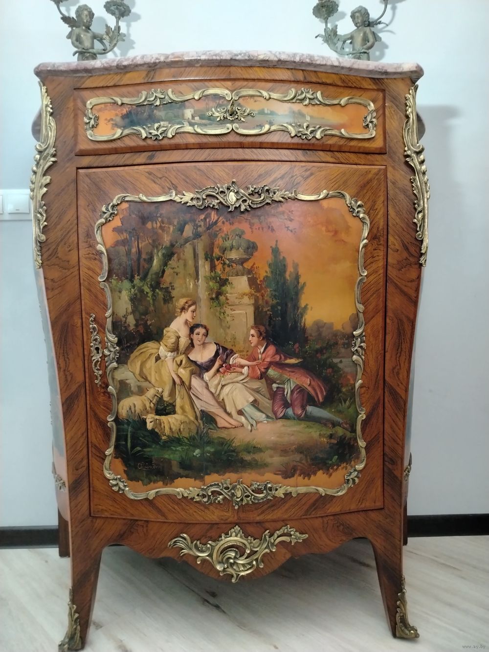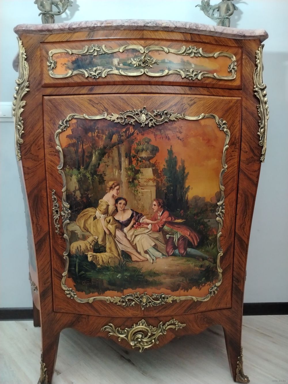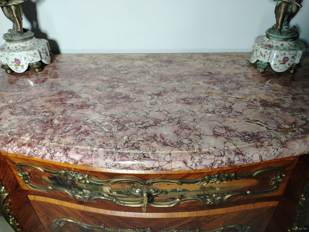 Прекрасный предмет мебели прошлых лет. Комод с художественной росписью и мраморной столешницей. Европа. Массив дерева, бронзовые элементы, роспись по дереву. Высота 115 см ширина 100 см глубина 45 см.