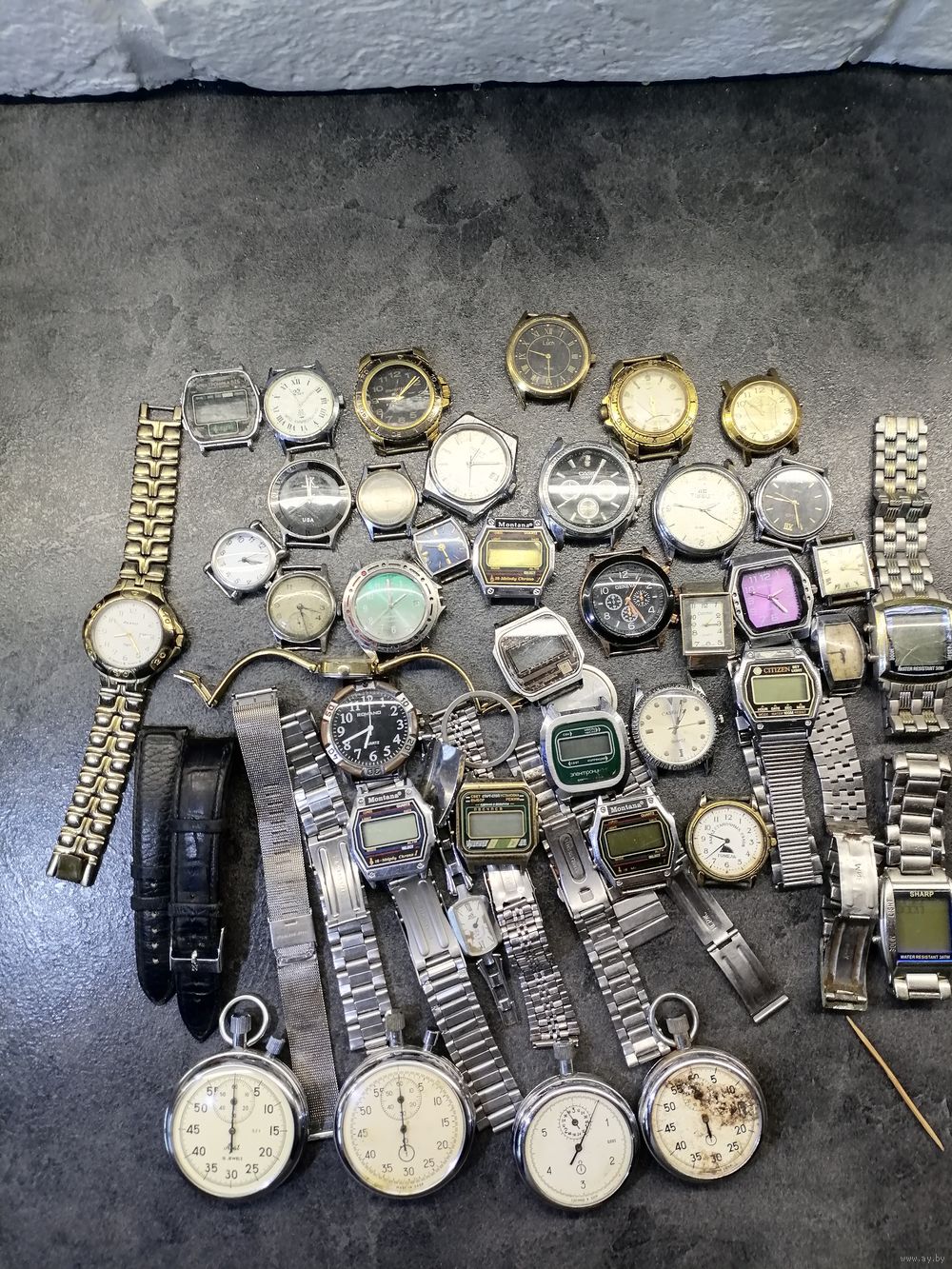 | В основном все на запчасти, несколько механических на ходу, кварцевые неизвестно, электронные когда-то шлисели питания( не все), секундомеры в ремонт либо на запчасти | |