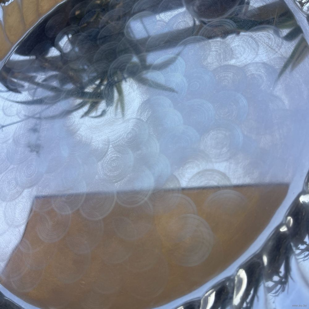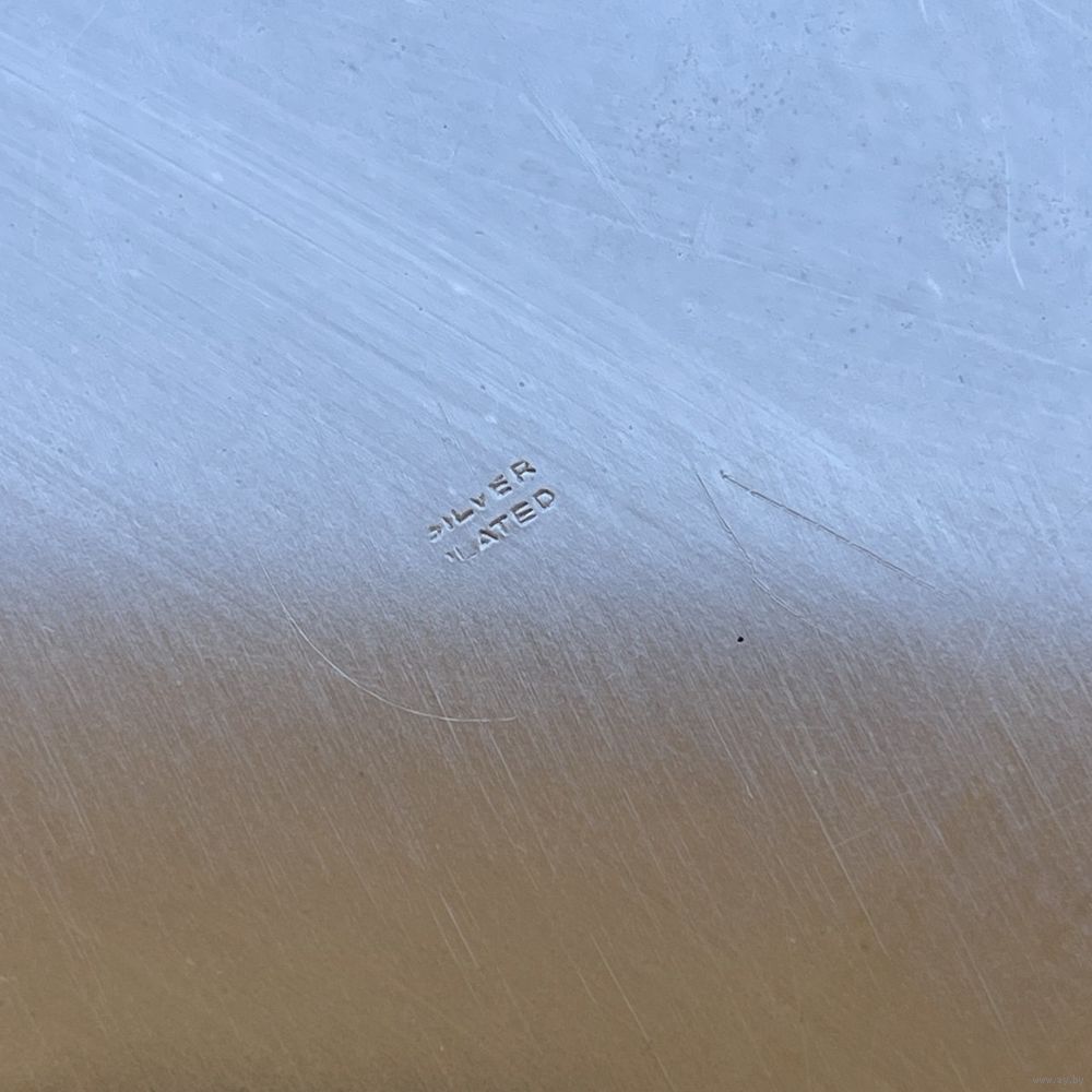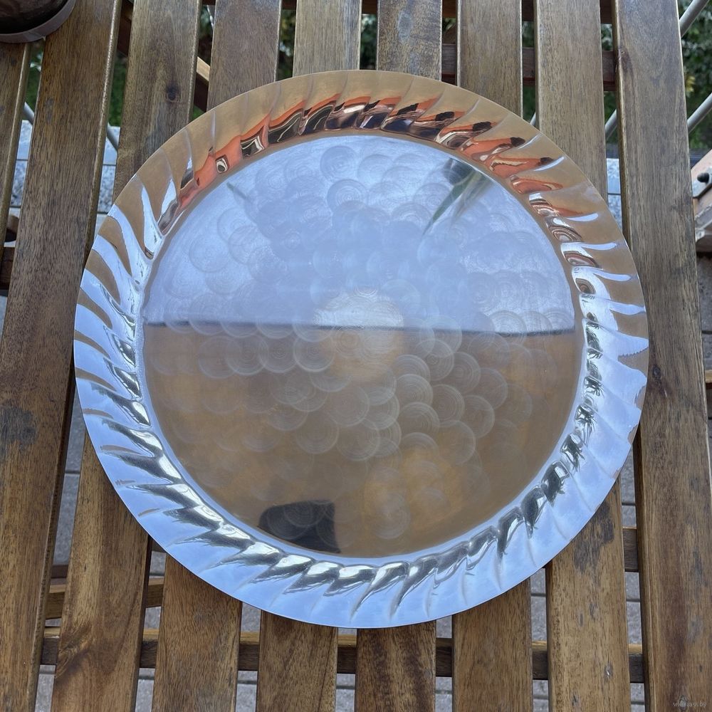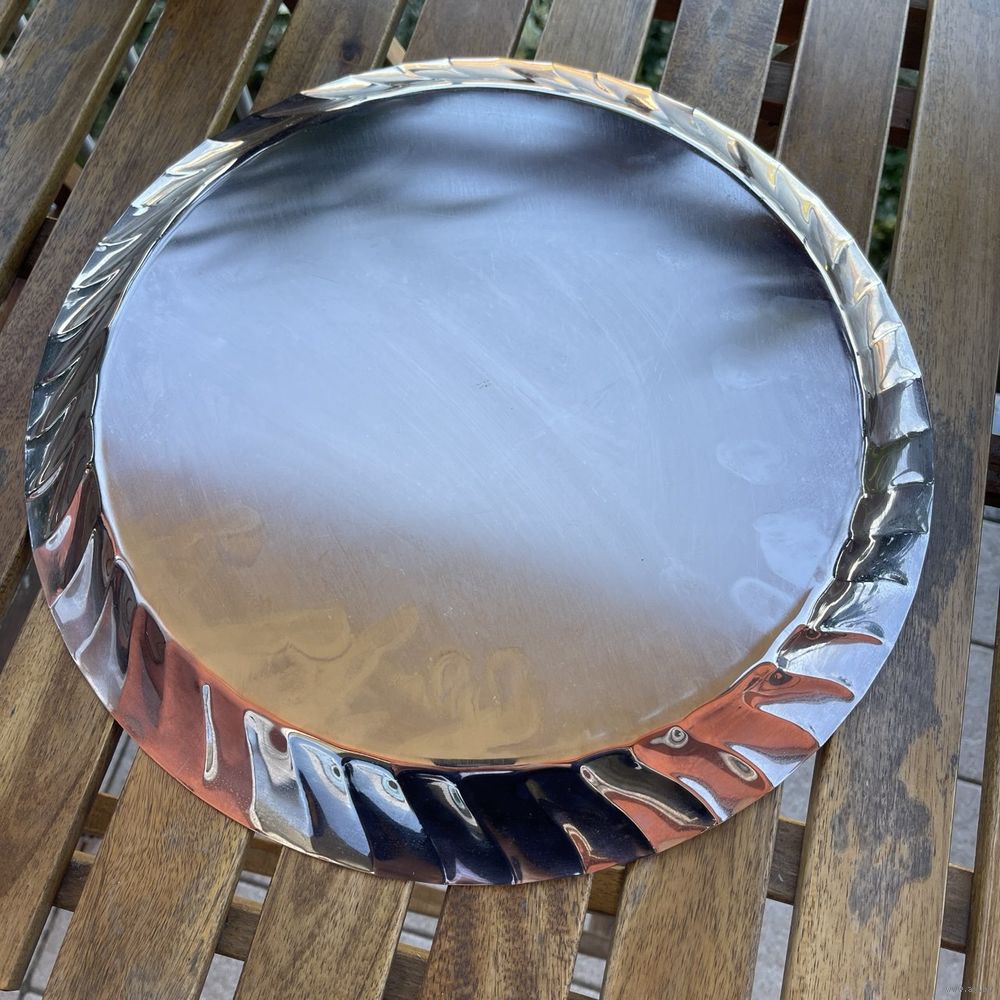 Большой антикварный поднос из металла с глубоким серебрением, блюдо для фруктов с рельефным фигурным бортиком. Италия. 1950- г.г. Клеймо. Диаметр 38 см, диаметр полезной части 30 см. Естественная патина.