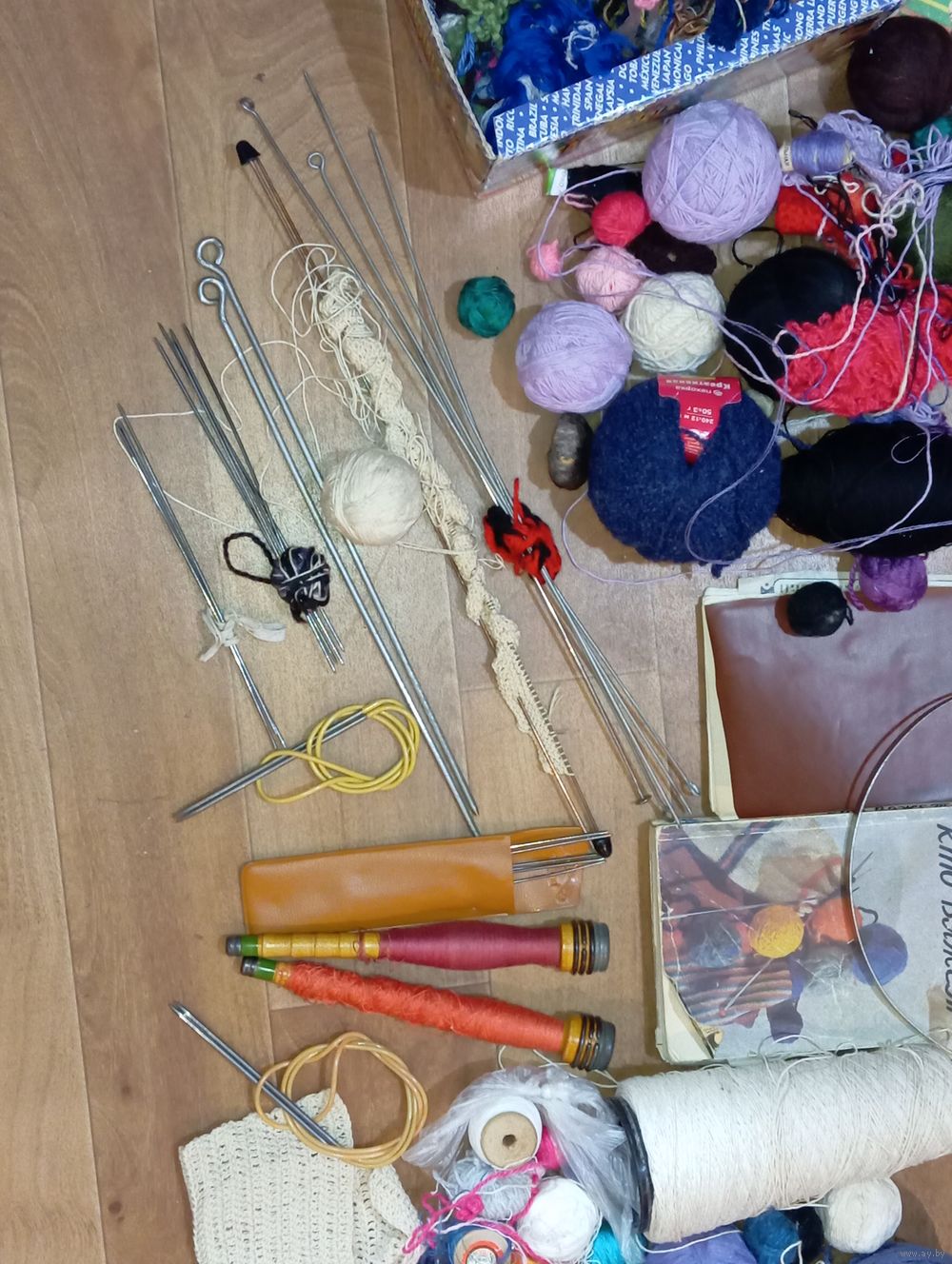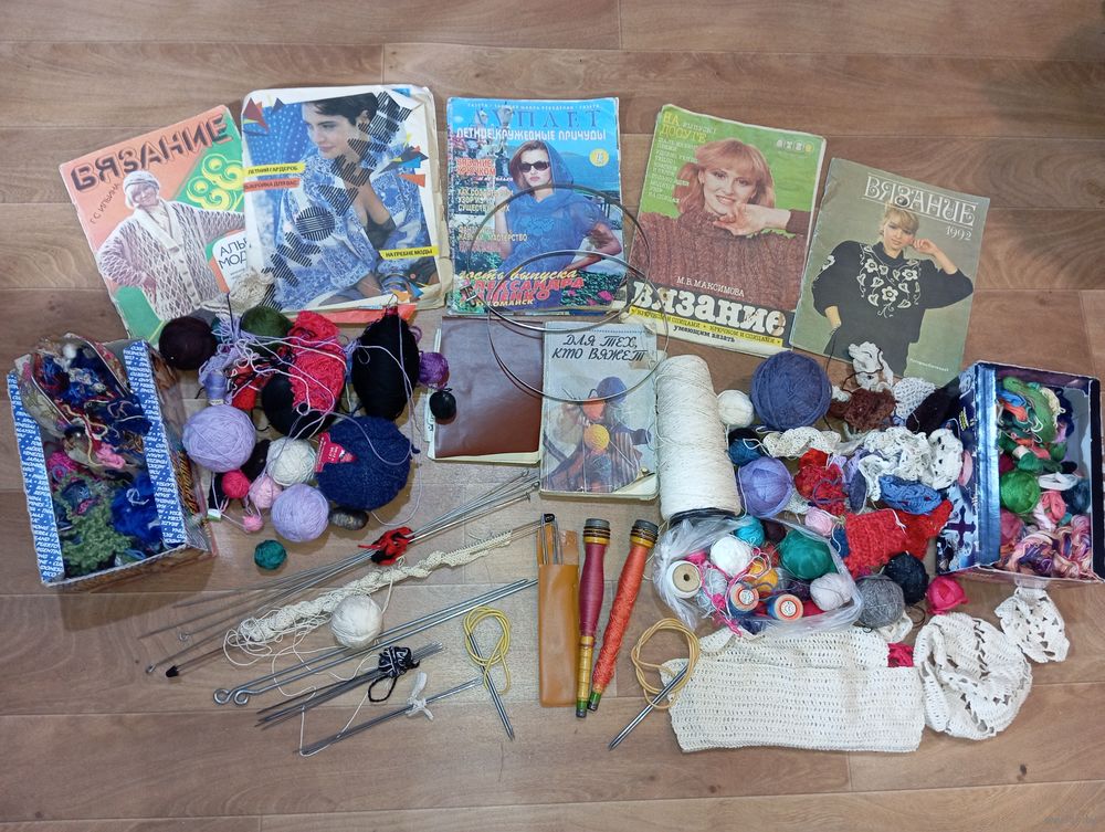 Большой винтажный набор для вязания : спици , нитки , журналы , заметки , и др .