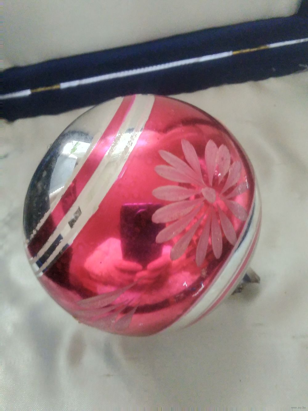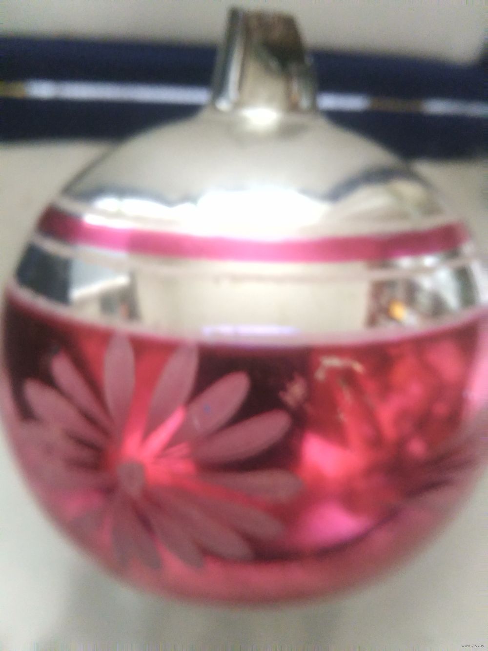 Скол трубочки и нет подвеса.Сохранилась яркя красивая окраска.Шар большой диаметром 11 см.