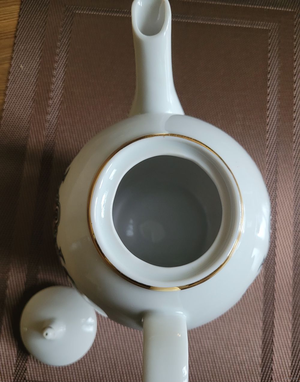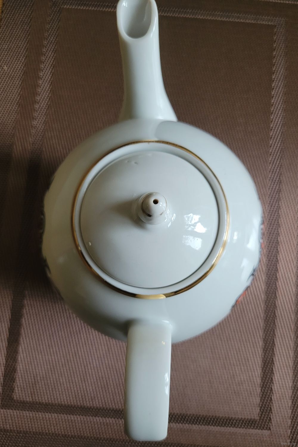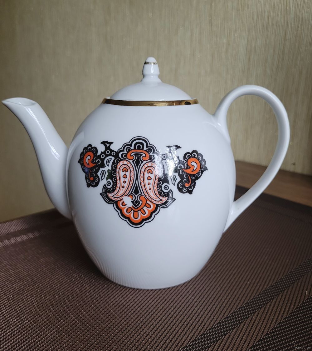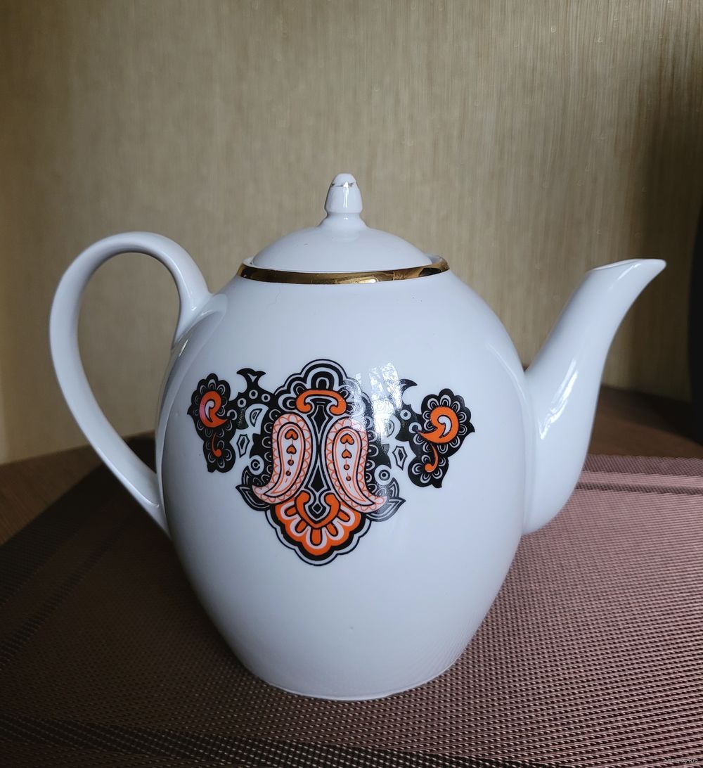 Большой заварочный чайник 1,3 л, деколь, отводка золотом. Рижский ФФЗ, 1970-80 гг. Есть один фабричный дефект деколи, пропущено клеймо, на дне только цена. Сколов и трещин нет. Крышка, вероятно, не родная. Наличие дефектов учтено в цене.