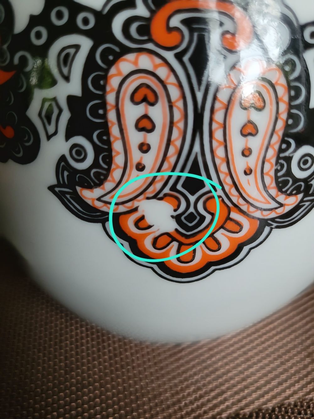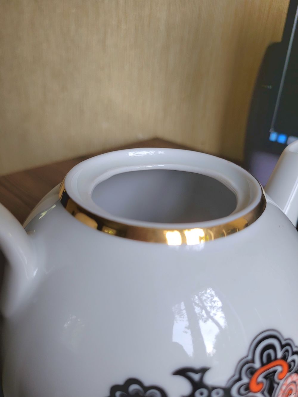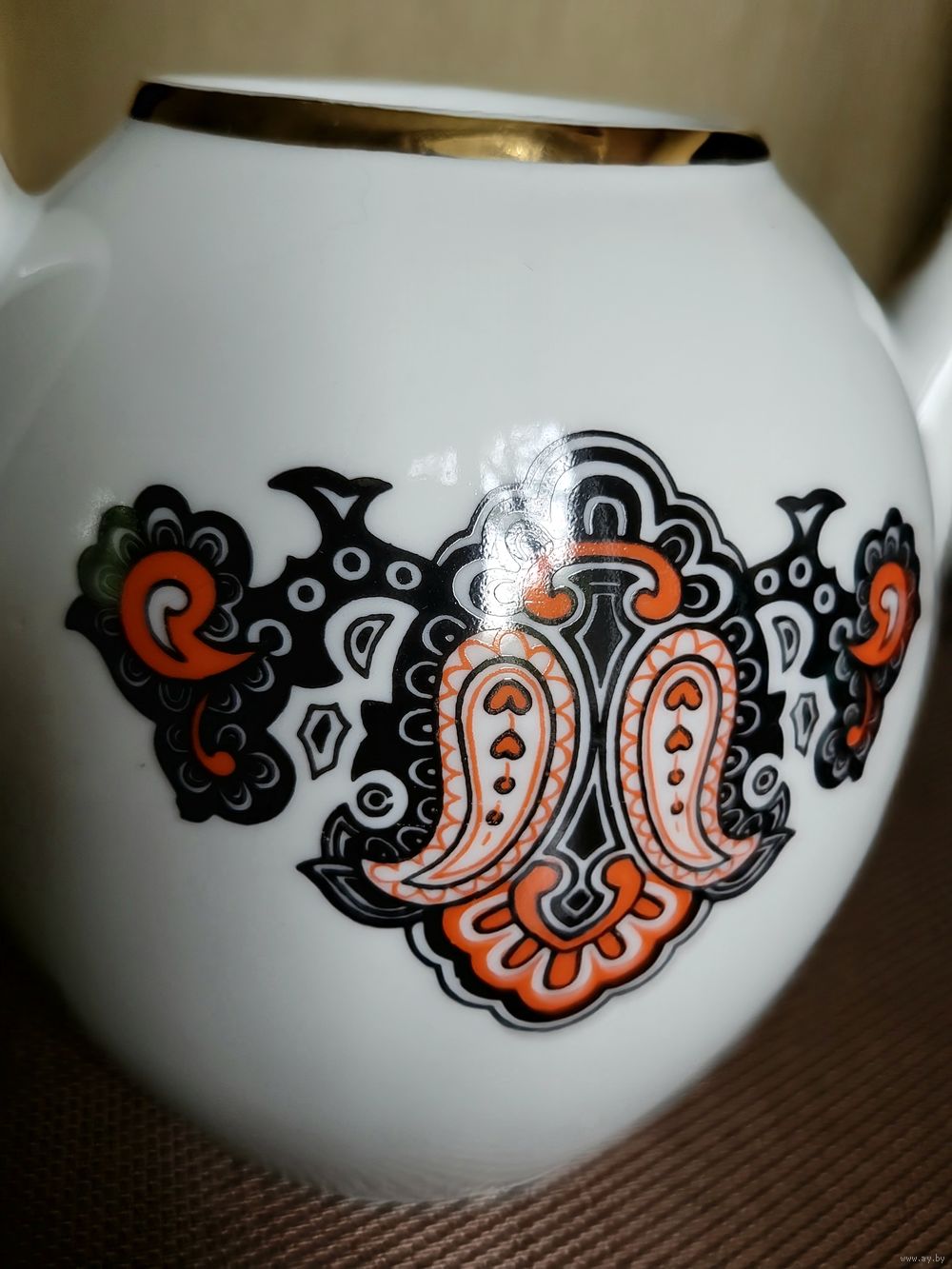 Большой заварочный чайник 1,3 л, деколь, отводка золотом. Рижский ФФЗ, 1970-80 гг. Есть один фабричный дефект деколи, пропущено клеймо, на дне только цена. Сколов и трещин нет. Крышка, вероятно, не родная. Наличие дефектов учтено в цене.