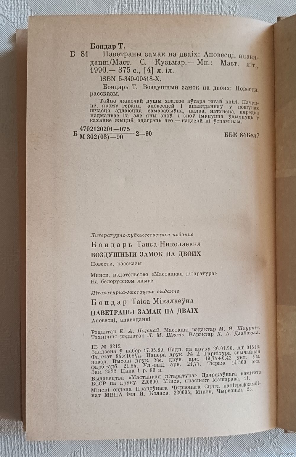 Бондар Таіса. Паветраны замак на дваіх: Аповесці, апавяданні. Мн.: Маст. літ., 1990.- 375 с., [4] л. іл.