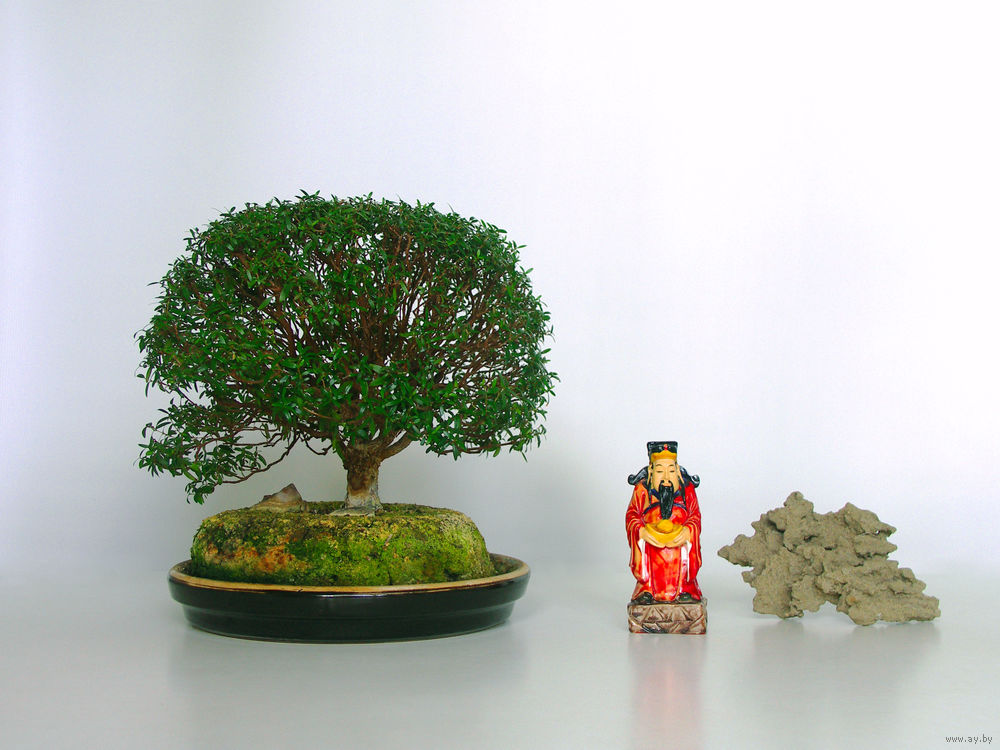 Бонсай. (мирт обыкновенный), по японской классификации сформирован в классическом прямостоячем стиле хокидати (Hokidachi), размер шохин (Shohin).полностью повторяет стиль одиночного прямостоячего дерева с мощными, равномерно расположенными по сторонам ветвями и корнями. Несмотря на столь скромные размеры, бонсай сохраняет все признаки взрослого произрастающего в природе дерева.