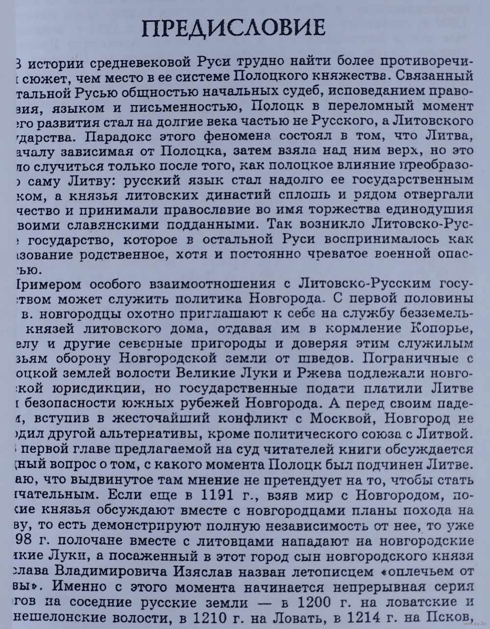 В первой главе предлагаемой на суд читателей книги обсуждается трудный вопрос о том, с какого момента Полоцк был подчинен Литве. Думаю, что выдвинутое там мнение не претендует на то, чтобы стать окончательным. Если еще в 1191 г., взяв мир с Новгородом, полоцкие князья обсуждают вместе с новгородцами планы похода на Литву, то есть демонстрируют полную независимость от нее, то уже в 1198 г. полочане вместе с литовцами нападают на новгородские Великие Луки, а посаженный в этот город сын новгородского князя Ярослава Владимировича Изяслав назван летописцем «оплечьем от Литвы». Именно с этого момента начинается непрерывная серия набегов на соседние русские земли - в 1200 г. на ловатские и нижнешелонские волости, в 1210 г. на Ловать, в 1214 г. на Псков, /5/ в 1217 г. на Шелонь, в 1223 г. на Торопец, в 1224 г. на Русу, в 1225 г. на новгородскую и смоленскую земли, в 1229 г. на южные волости Новгорода и на Селигер, в 1234 г. снова на Русу и т.д. Очевидно, что плацдармом для всех этих нападений служила Полоцкая земля, оказавшаяся тогда в несомненном подчинении Литве. О том же свидетельствуют и оборонительные усилия новгородцев, которые в 1200 г. посылают в Великие Луки воеводу, а в 1211 г. воздвигают там новые фортификации. В 1239 г. князь Александр Ярославич создает целую систему укрепленных городков на Шелони, явно предназначенных для обороны от Литвы там, где пролегал путь литовских набегов, берущий начало в Полоцкой и Витебской землях.