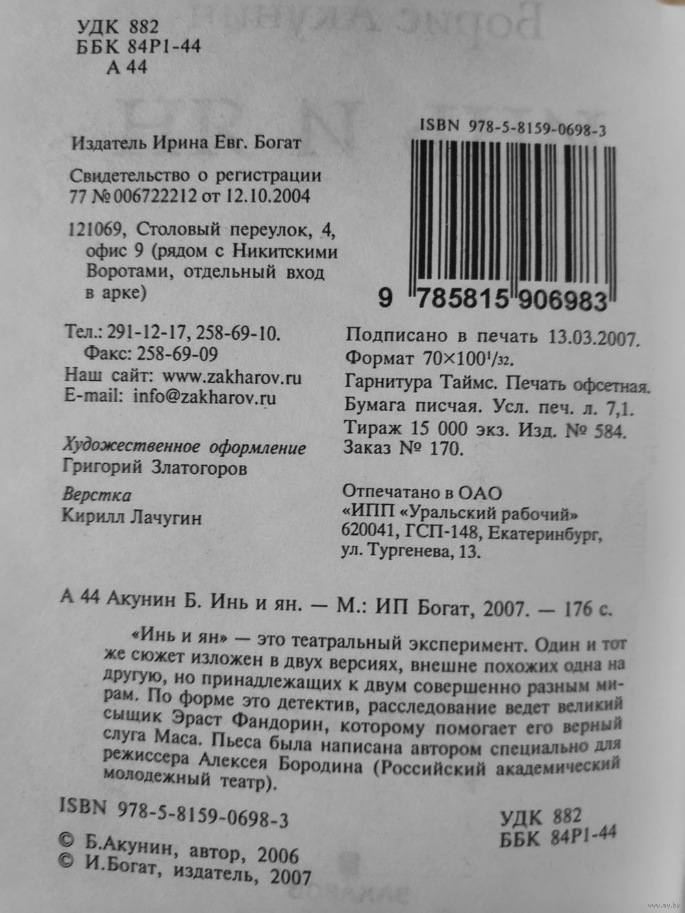 "Инь и Ян" - это театральный эксперимент. Один и тот же сюжет изложен в одной книге в двух версиях, внешне похожих одна на другую, но принадлежащих двум совершенно разным мирам. По форме это детектив, расследование ведет великий сыщик Эраст Фандорин, которому помогает его верный слуга Маса. Пьеса была написана специально для режиссера Алексея Бородина (Российский академический молодежный театр).
