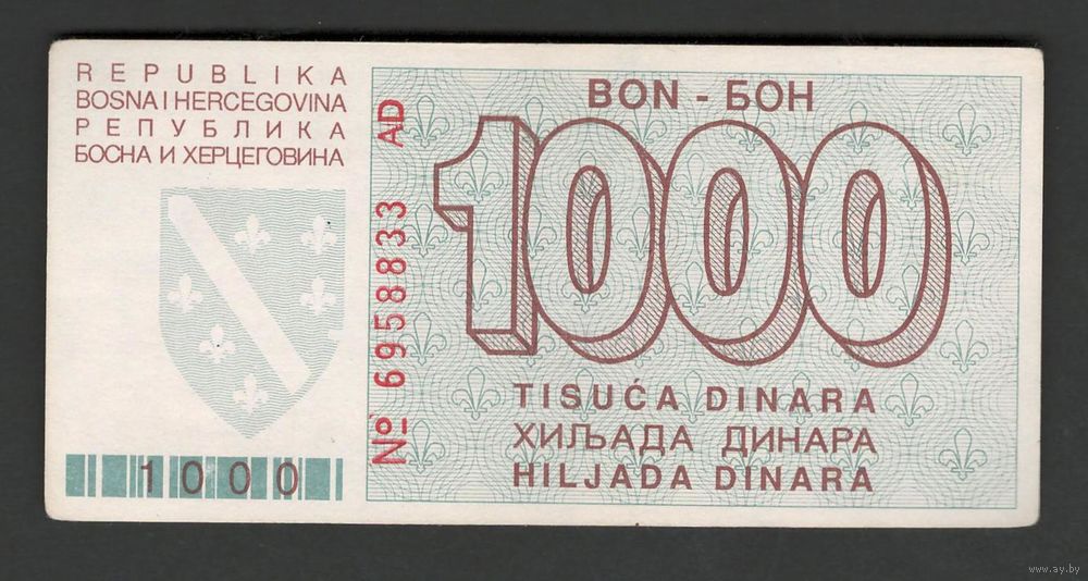 Босния и Герцеговина 1000 динар 1992 года. Тип Р-26. Состояние aUNC-