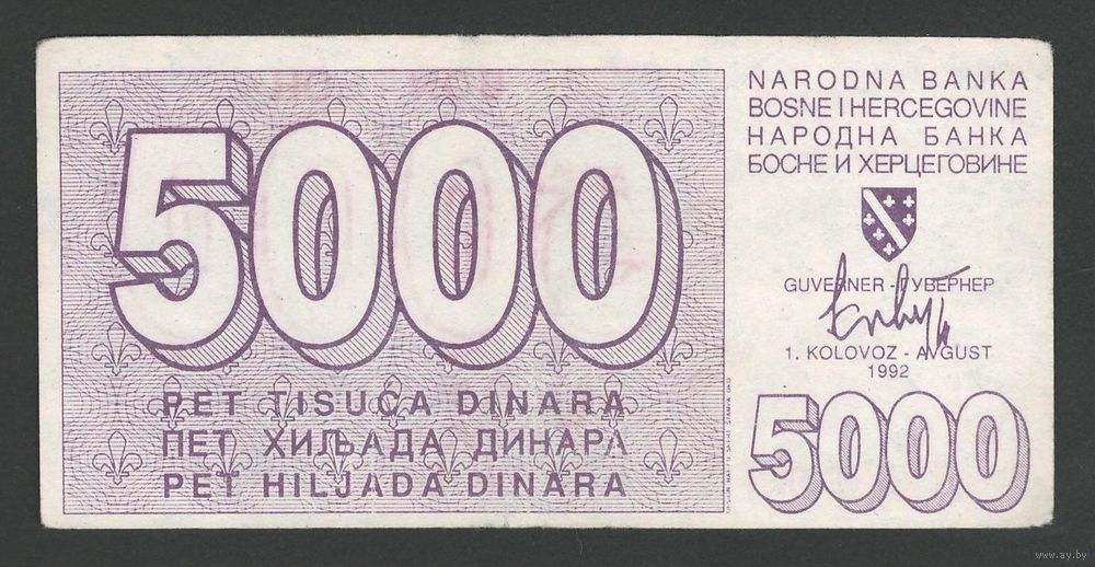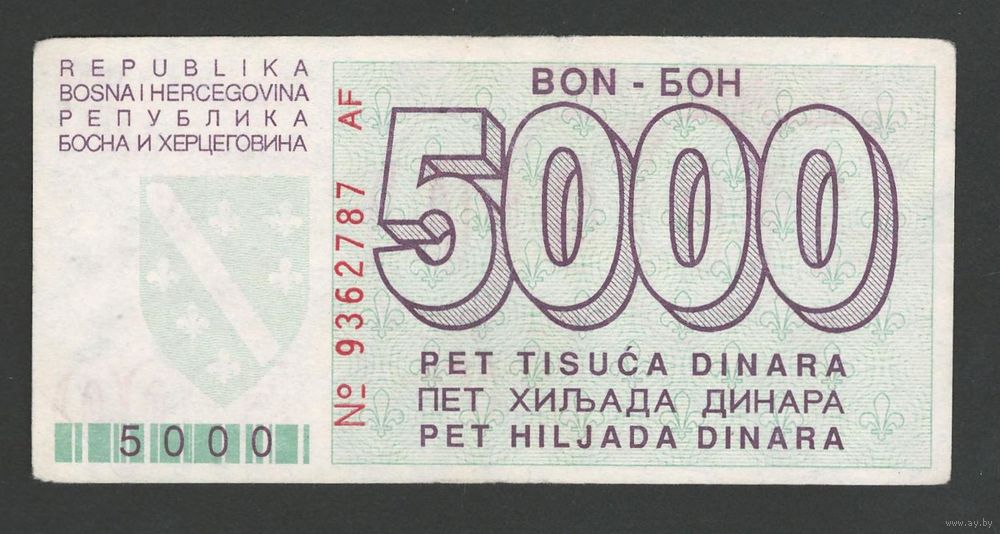 Босния и Герцеговина 5000 динар 1992 года. Тип Р-27. Состояние XF-