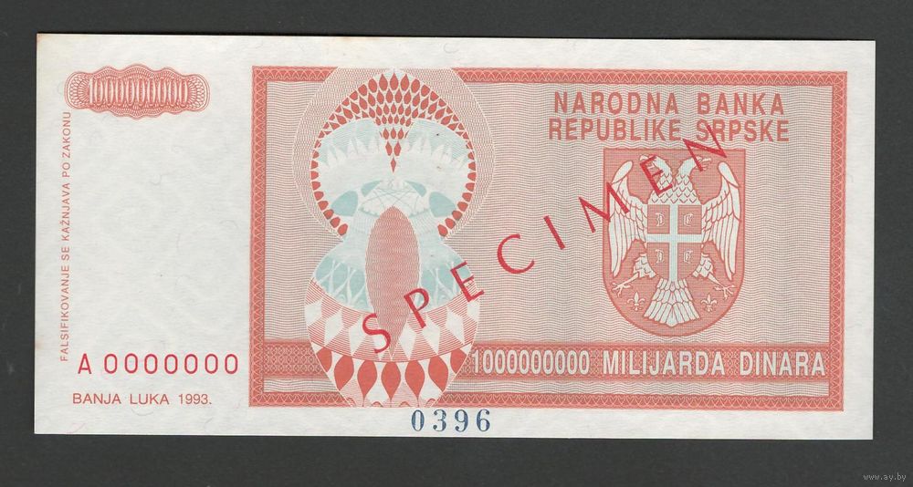 Босния и Герцеговина Республика Серпска 1000000000 динар 1993 года. SPECIMEN. Тип Р-147. Состояние UNC!