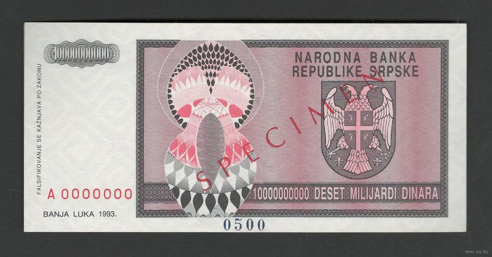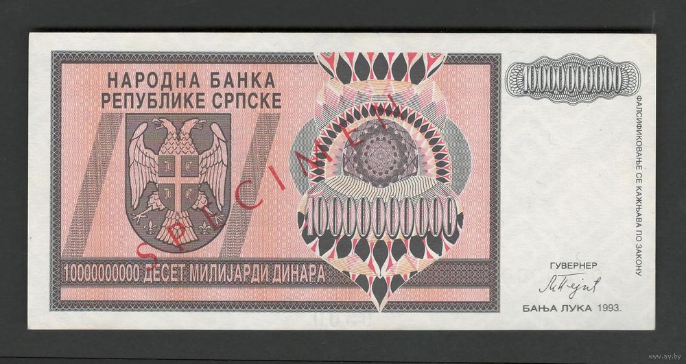 Босния и Герцеговина Республика Серпска 10000000000 динар 1993 года. SPECIMEN. Тип Р-148. Состояние UNC!