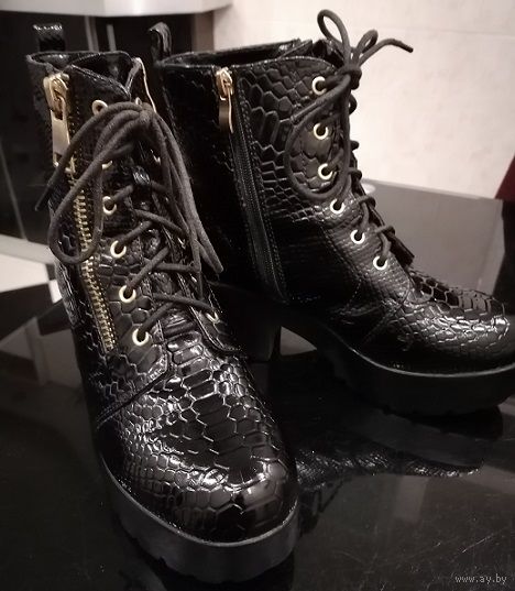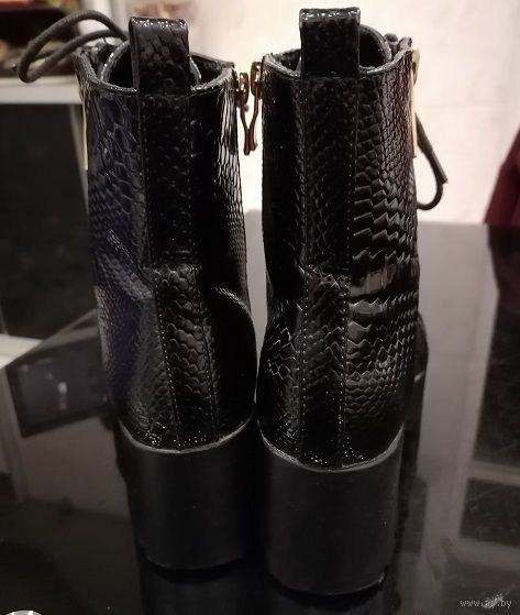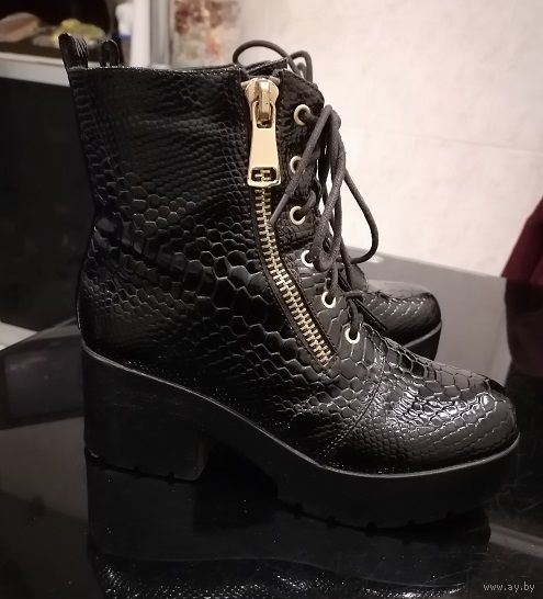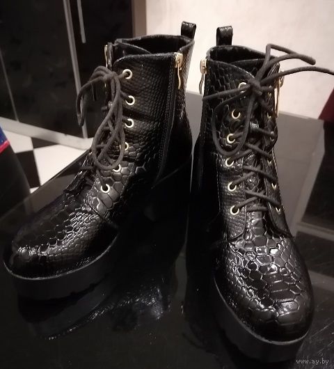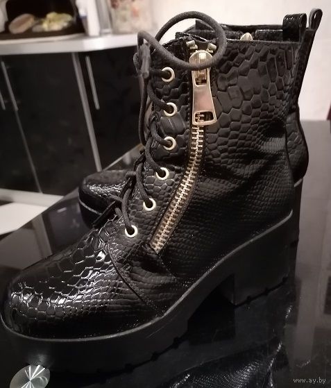 Высокие ботиночки деми, б/у, в отличном состоянии, р-р 38. Дефект на фото 7 (маленькая царапина на внутренней стороне). Очень удобные, по стельке 24,5-25см, каблук 6,5см, танкетка 3,5см (разница 3см совсем не ощутима). Купила на сайте дороже, но не подошли на широкую ступню (поджимают косточку на ноге).