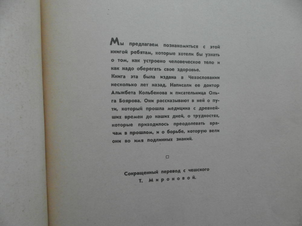 Эта замечательная научно-популярная книга рассказывает о том, как устроено человеческое тело и как надо оберегать свое здоровье. Впервые книга была издана в Праге в 1960-х годах. Написали ее доктор Альжбета Кольбенова и писательница Ольга Боярова. Они рассказывают о пути, который прошла медицина с древнейших времен до наших дней, о трудностях, которые приходилось преодолевать врачам в прошлом, и о борьбе которую вели они во имя подлинных знаний. В специальных разделах книги доступно и интересно рассказано о различных системах и органах человеческого организма.