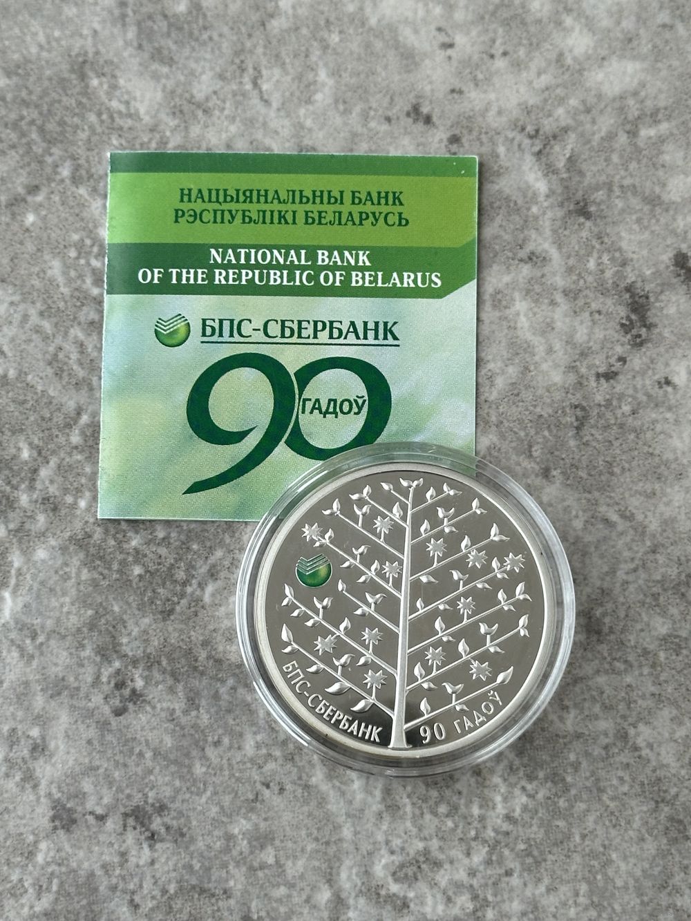 в центре монеты – изображение цветущего дерева жизни, вверху – изображение товарного знака ОАО "БПС-Сбербанк" (на серебряной монете номиналом 20 рублей оно исполнено методом тампопечати), внизу по кругу надпись: БПС-СБЕРБАНК. 90 ГАДОЎ.