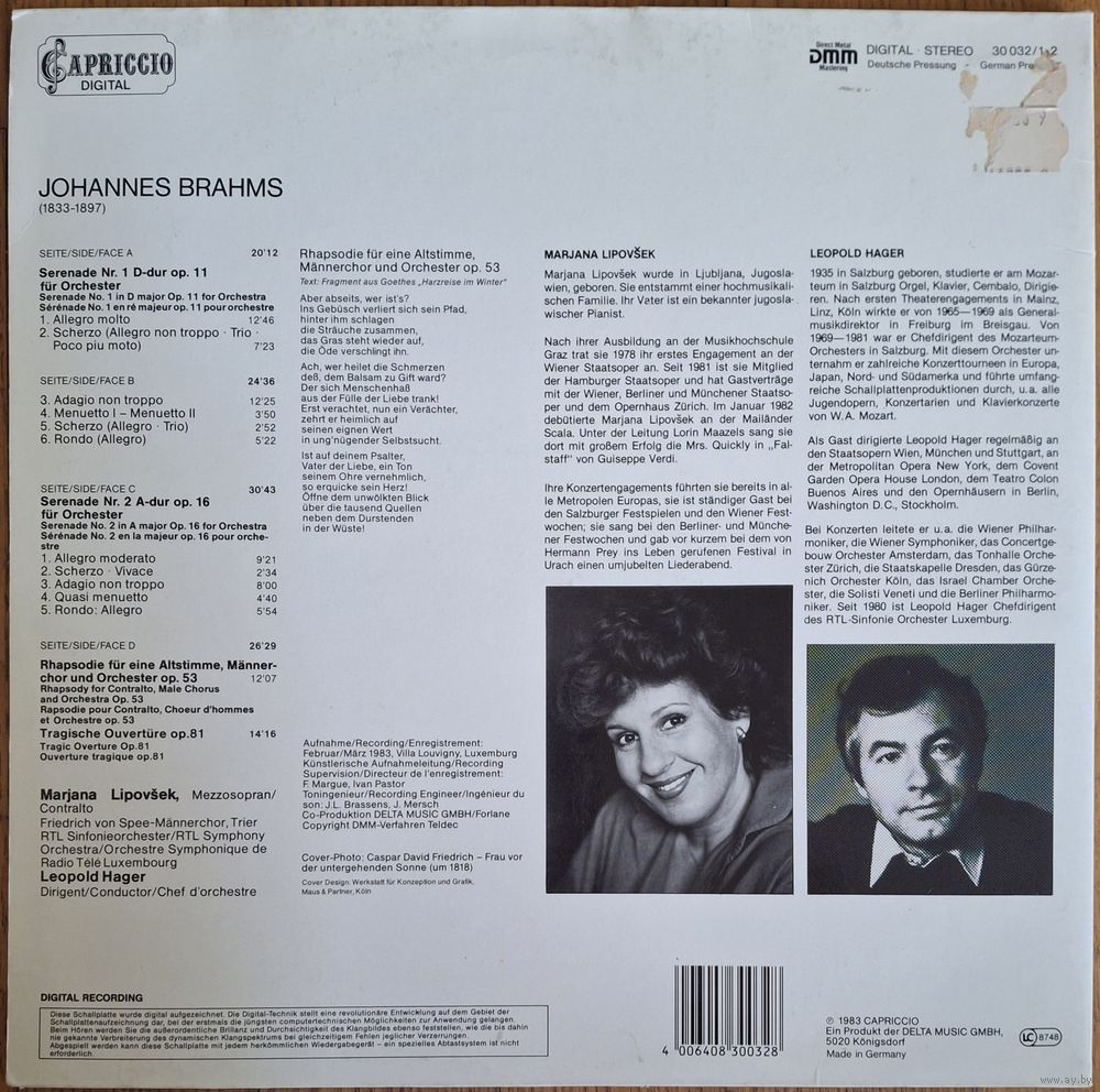 Brahms, Marjana Lipovsek, RTL Sinfonieorchester – Die Serenaden fur Orchester / Tragische Ouverture / Alt-Rhapsodie. 2LP
