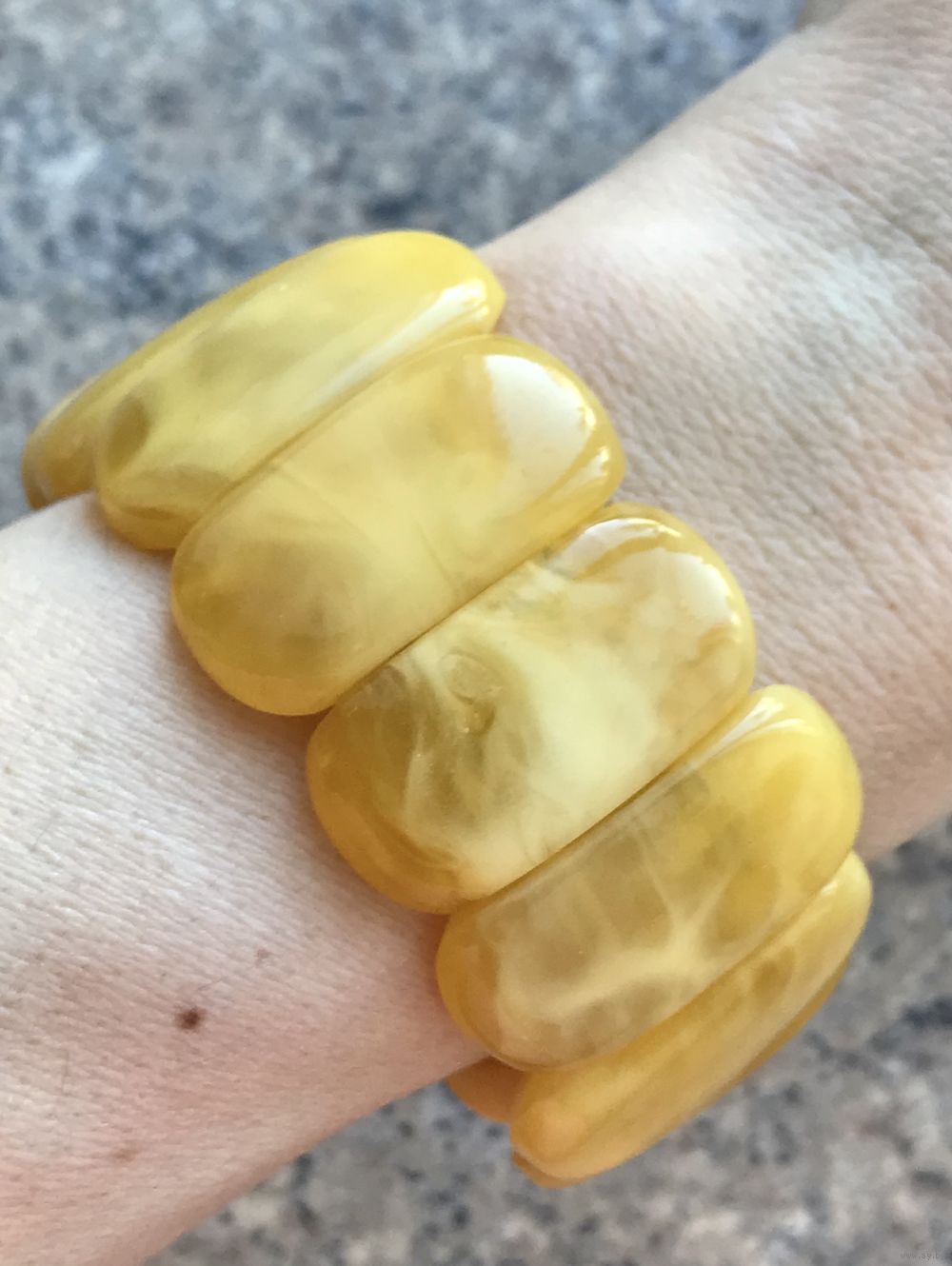 Винтажный браслет из пластика под янтарь на резинке. Высота 3см. Состояние хорошее.