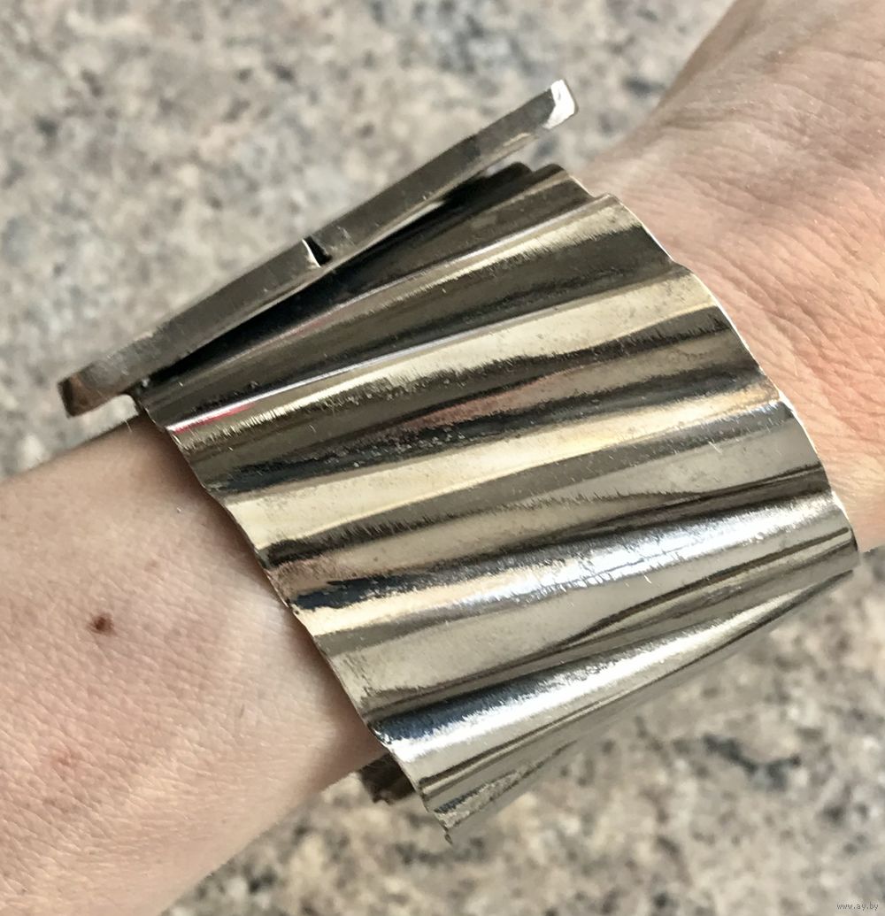 Крупный браслет с основой из металла с серебрением и вставкой из чёрного агата. Высота браслета 4,3см., размер вставки 5х2,5см. Подойдёт на широкое запястье. Ручная работа. Состояние хорошее.