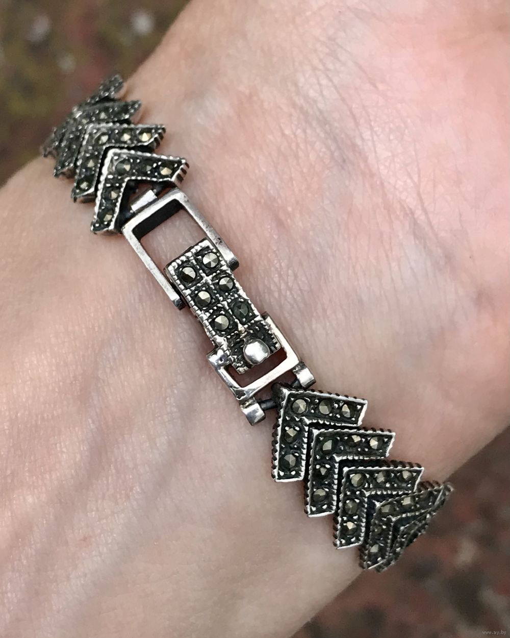 Винтажный браслет из серебра 925пр., на лицевой стороне вставки из марказитов. Длина браслета 18см., высота 1,2см., вес 19,44гр. Все вставки на месте. Состояние хорошее.