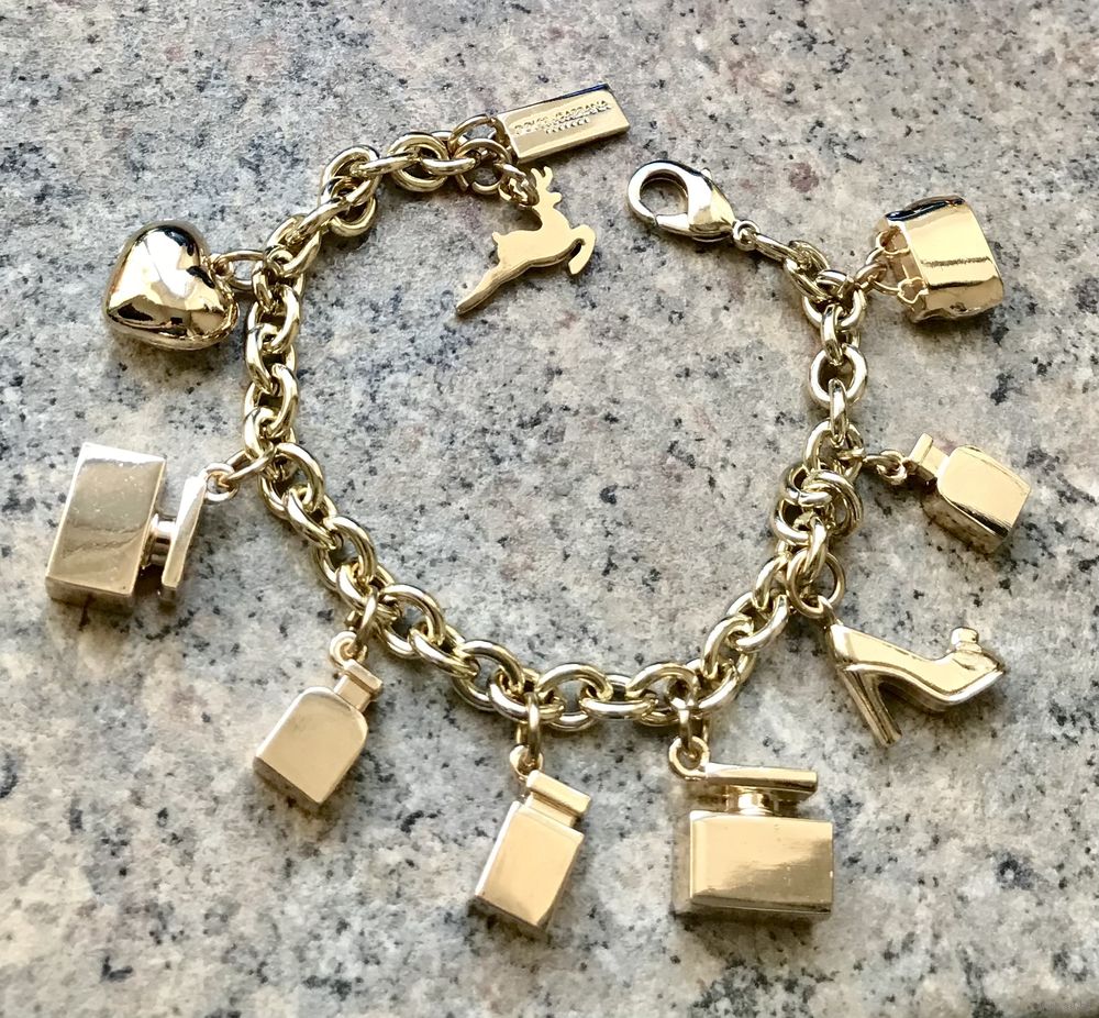 Браслет из сплава золотого тона с шармами. Dolce&Gabbana. Оригинал. На некоторых шармах имеются царапины. Длина браслета 22см. Тяжёленький (вес около 80гр.) Мешочек для хранения утерян.