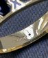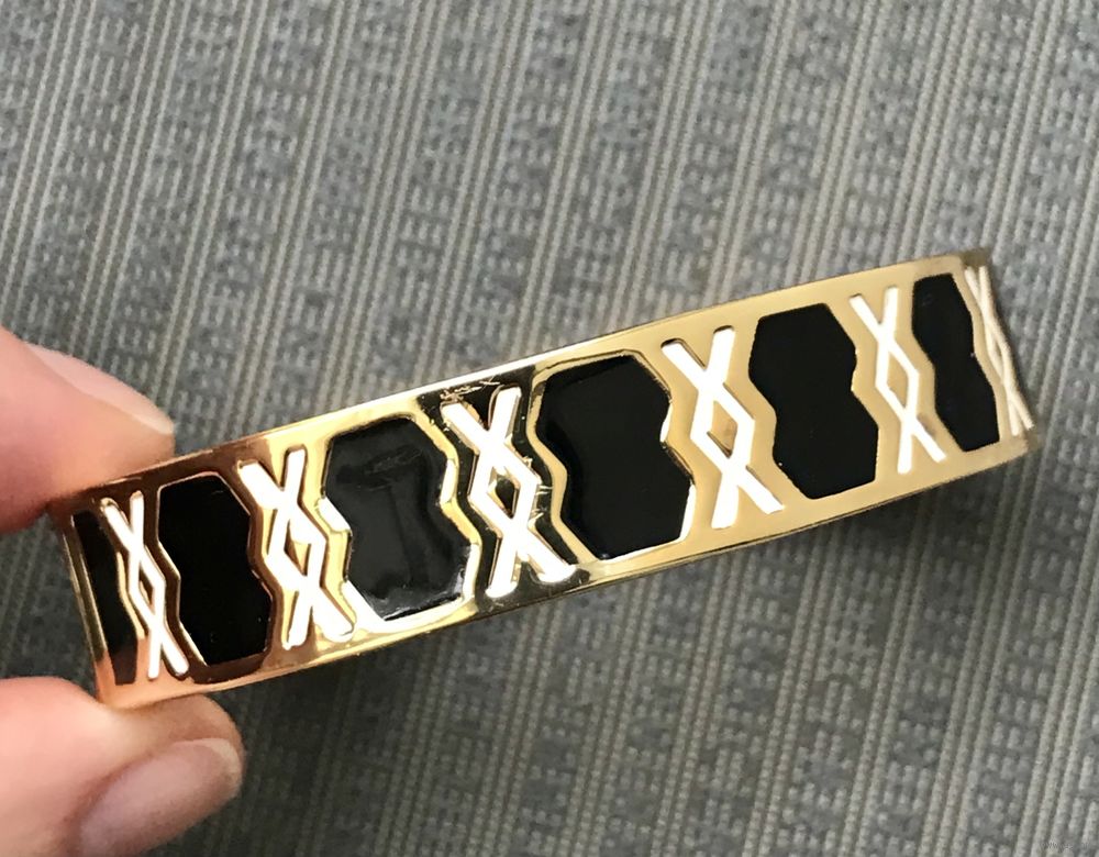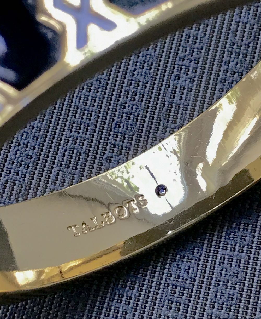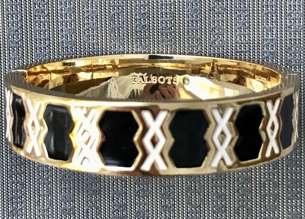 Эффектный браслет от американской компании Talbots. Компания была основана в 1947 году. Начиналась с маленького магазинчика и выросла в крупную сеть производящую качественную одежду и аксессуары. Существует по настоящее время. Браслет выполнен из металла золотого тона, лицевая сторона украшена эмалью. Высота 1,5см., вн.диаметр 6,2см., толщина 0,4см. Разъемный. Маркирован. Тяжёленький. Состояние хорошее.